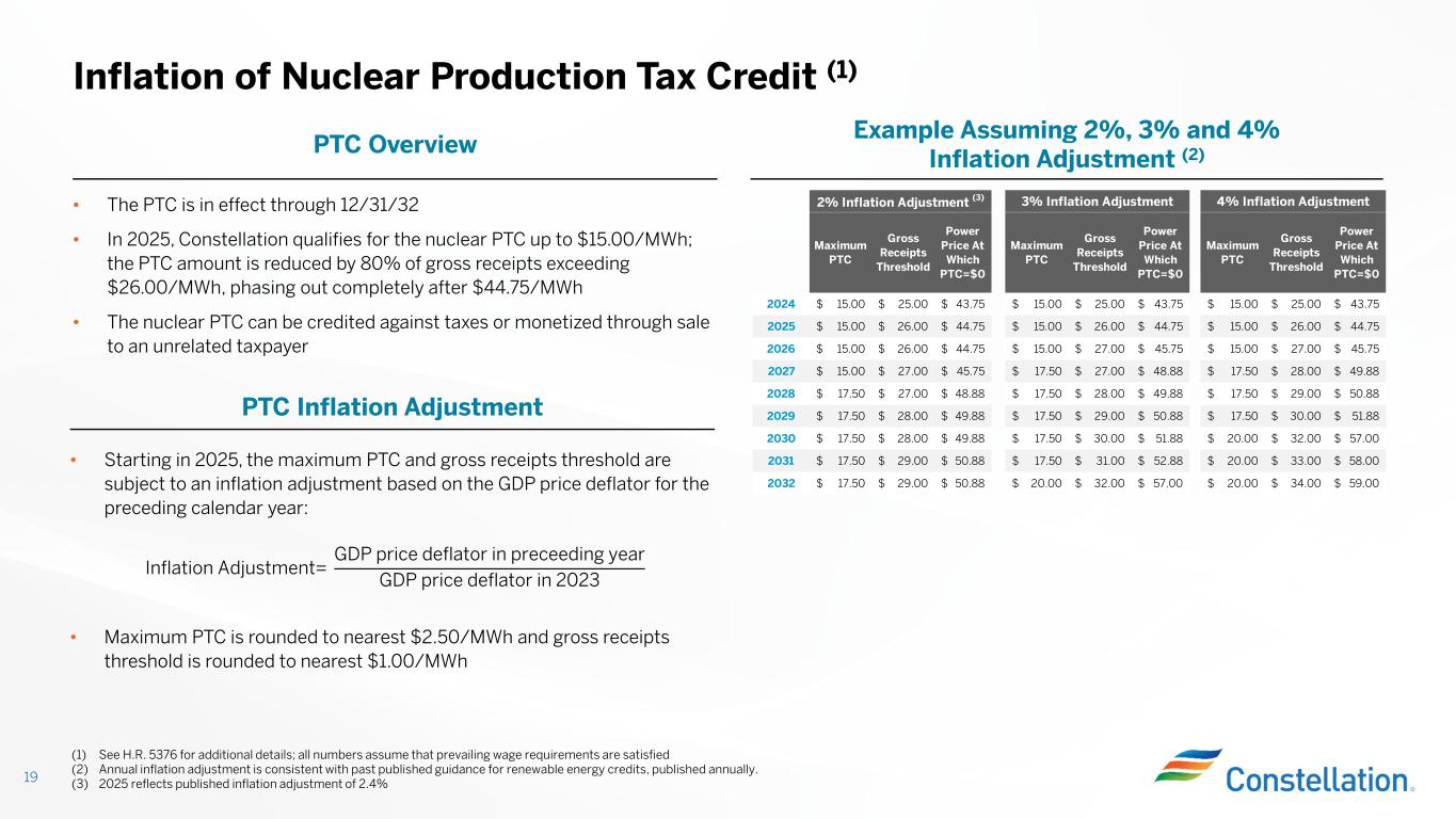20 25 30 35 40 45 50 55 60 20 25 30 35 40 45 50 55 60 Market Revenues ($/MWh) M ar ke t R ev en u es + P T C ( $ / M W h ) 18 PTC Provides Support for Nuclear Units When Revenues Fall Below $44.75/MWh (1) Illustrative Payoff Dynamics for Non-State-Supported Units in 2025 • The PTC provides support of up to $15.00/MWh for units when revenues are between $26.00/MWh and $44.75/MWh while preserving the ability of the unit to participate in upside from commodity markets • The green line assumes revenues of $47.00/MWh. Since it is above the $44.75/MWh PTC phase out units would not receive PTC value • When revenues fall below the $44.75/MWh phase out, the PTC will provide revenue support for the units, bringing effective realized revenues back to $44.75 • Assuming revenues of $35.00/MWh, the orange line, we would expect units to receive $7.80/MWh PTC, bringing the total value the unit would receive to $42.80/MWh and $45.40/MWh (2) on a tax adjusted basis Competitive Unit Payoff $35/MWh $47/MWh PTC provides support from $26/MWh - $44.75/MWh (1) See H.R. 5376 for additional details; all numbers assume that prevailing wage requirements are satisfied (2) Grossed up assuming 25% tax rate