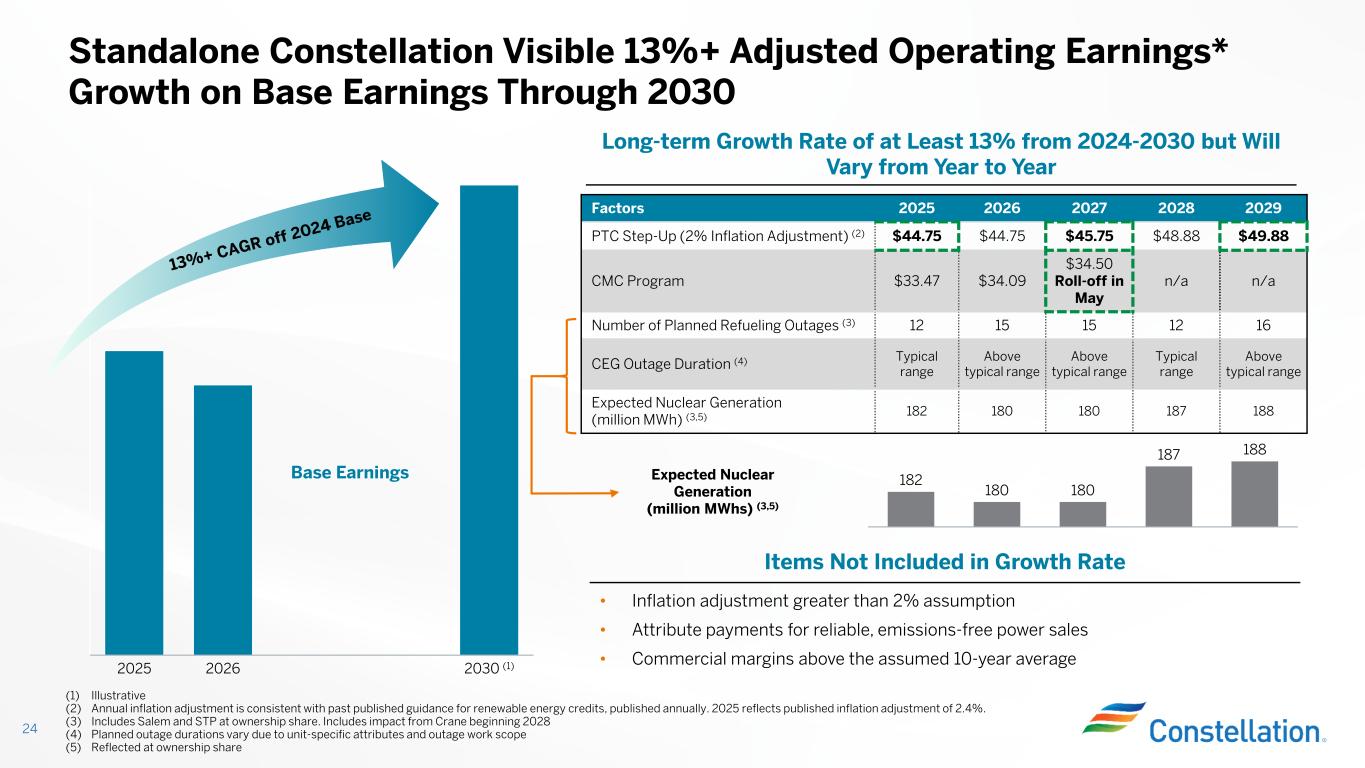 2025 2026 2030 (1) 20292028202720262025Factors $49.88$48.88$45.75$44.75$44.75PTC Step-Up (2% Inflation Adjustment) (2) n/an/a $34.50 Roll-off in May $34.09$33.47CMC Program 1612151512Number of Planned Refueling Outages (3) Above typical range Typical range Above typical range Above typical range Typical rangeCEG Outage Duration (4) 188187180180182 Expected Nuclear Generation (million MWh) (3,5) 24 Standalone Constellation Visible 13%+ Adjusted Operating Earnings* Growth on Base Earnings Through 2030 Long-term Growth Rate of at Least 13% from 2024-2030 but Will Vary from Year to Year • Inflation adjustment greater than 2% assumption • Attribute payments for reliable, emissions-free power sales • Commercial margins above the assumed 10-year average Items Not Included in Growth Rate Base Earnings 182 180 180 187 188 Expected Nuclear Generation (million MWhs) (3,5) (1) Illustrative (2) Annual inflation adjustment is consistent with past published guidance for renewable energy credits, published annually. 2025 reflects published inflation adjustment of 2.4%. (3) Includes Salem and STP at ownership share. Includes impact from Crane beginning 2028 (4) Planned outage durations vary due to unit-specific attributes and outage work scope (5) Reflected at ownership share