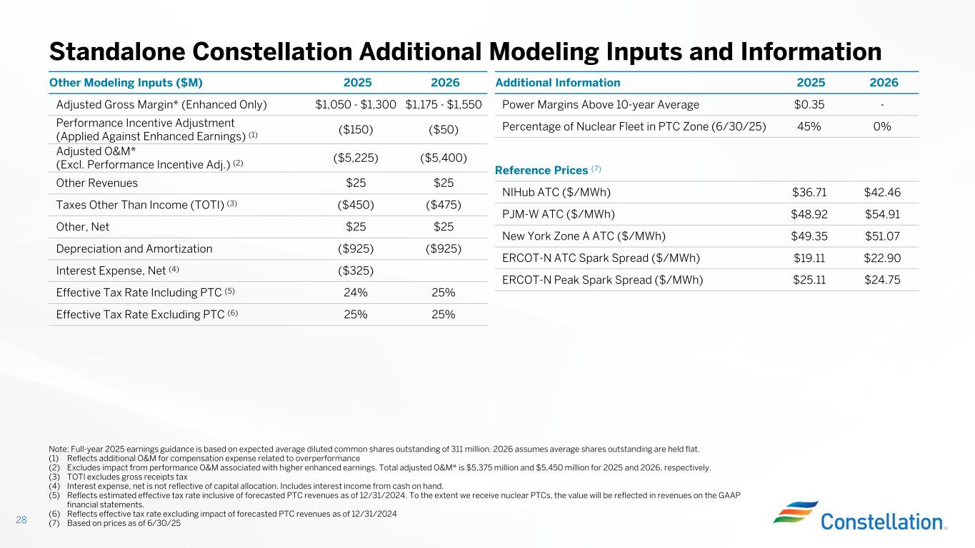 Standalone Constellation Detailed Modeling Inputs for Base Earnings (continued) 27 (1) Hydro revenue price and representative spark spread reflect consistent historical average we have achieved across hydro and fossil assets, respectively (2) Volumes are rounded and reflect Constellation’s ownership share of partially owned units (3) ISO-NE: ISO New England; NEMA: Northeastern Massachusetts and Boston; SEMA: Southeastern Massachusetts (4) Represents offered capacity at ownership Expected Generation (million MWhs) Non-Nuclear (Energy) 2025 2026 Wind/Solar 5 5 Historical renewable contracts $60 - $70 Hydro 2 2 Hydro revenue price ($/MWh) $45 Natural Gas, Oil, Other 20 18 Representative spark spread ($/MWh) $20 2024/2025 2025/2026 Non-Nuclear (Capacity) Cleared Volumes (MW) (2) Cleared Prices ($/MW-day) Cleared Volumes (MW) (2) Cleared Price ($/MW-day) EMAAC 1,950 $55 1,525 $270 MAAC 200 $49 100 $270 BGE 425 $73 325 $466 Total PJM Portfolio 2,575 1,950 2024/2025 2025/2026 Capacity (4) Price ($/MW-day) Capacity (4) Price ($/MW-day) NEMA 115 $131 125 $87 SEMA 235 $632 235 $87 Total ISO-NE (3) 350 360 Modeling Prices ($/MWh) (1) Note: Base earnings assumes clearing price of $150/MW-d. Capacity revenues for nuclear units are included in the gross receipts calculation for the PTC and therefore not provided