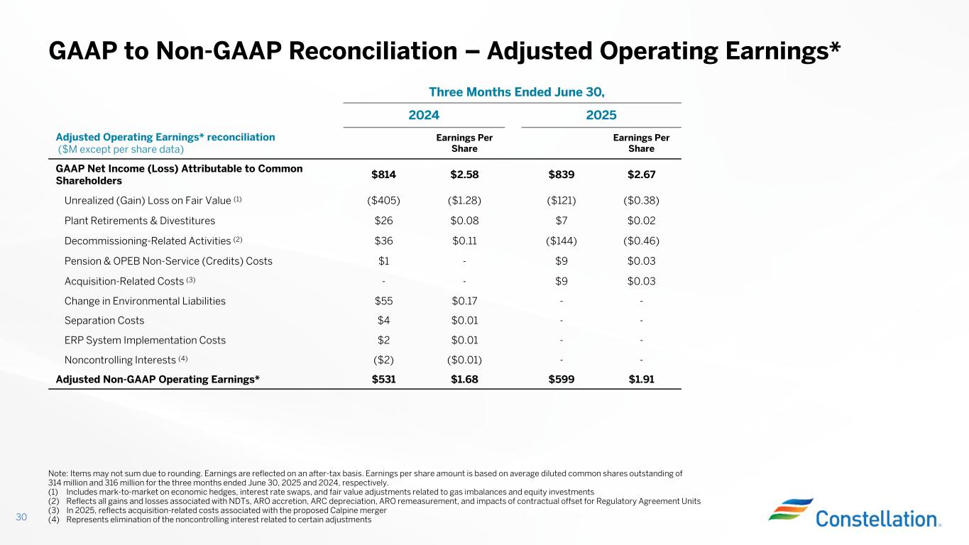 Three Months Ended June 30, 20252024 Earnings Per Share Earnings Per Share Adjusted Operating Earnings* reconciliation ($M except per share data) $2.67$839$2.58$814 GAAP Net Income (Loss) Attributable to Common Shareholders ($0.38)($121)($1.28)($405)Unrealized (Gain) Loss on Fair Value (1) $0.02$7$0.08$26Plant Retirements & Divestitures ($0.46)($144)$0.11$36Decommissioning-Related Activities (2) $0.03$9-$1Pension & OPEB Non-Service (Credits) Costs $0.03$9--Acquisition-Related Costs (3) --$0.17$55Change in Environmental Liabilities --$0.01$4Separation Costs --$0.01$2ERP System Implementation Costs --($0.01)($2)Noncontrolling Interests (4) $1.91$599$1.68$531Adjusted Non-GAAP Operating Earnings* GAAP to Non-GAAP Reconciliation – Adjusted Operating Earnings* 30 Note: Items may not sum due to rounding. Earnings are reflected on an after-tax basis. Earnings per share amount is based on average diluted common shares outstanding of 314 million and 316 million for the three months ended June 30, 2025 and 2024, respectively. (1) Includes mark-to-market on economic hedges, interest rate swaps, and fair value adjustments related to gas imbalances and equity investments (2) Reflects all gains and losses associated with NDTs, ARO accretion, ARC depreciation, ARO remeasurement, and impacts of contractual offset for Regulatory Agreement Units (3) In 2025, reflects acquisition-related costs associated with the proposed Calpine merger (4) Represents elimination of the noncontrolling interest related to certain adjustments