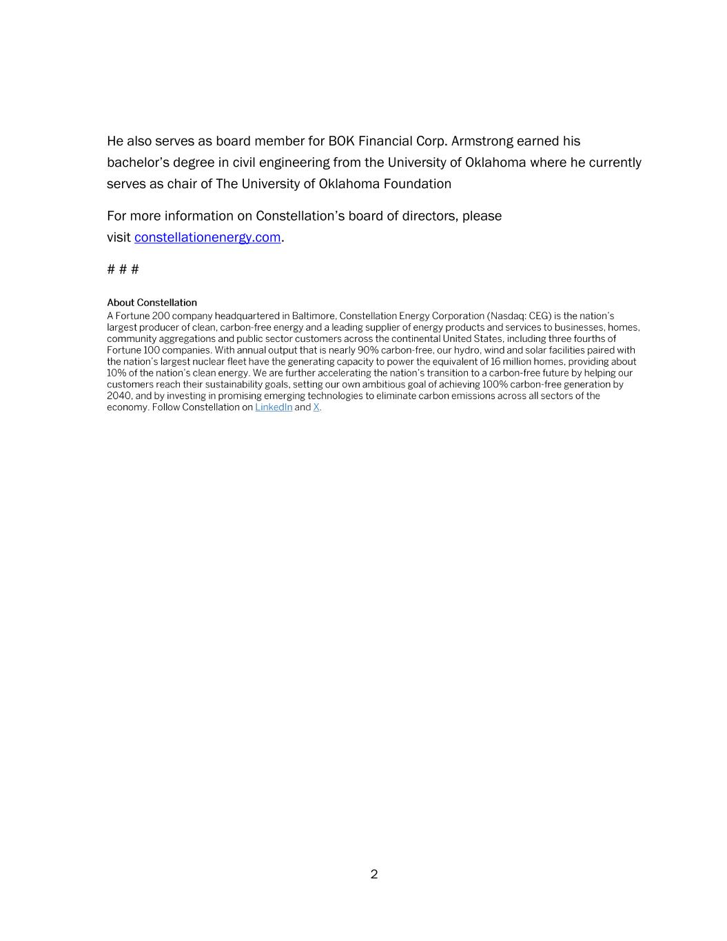 2 He also serves as board member for BOK Financial Corp. Armstrong earned his bachelor’s degree in civil engineering from the University of Oklahoma where he currently serves as chair of The University of Oklahoma Foundation For more information on Constellation’s board of directors, please visit constellationenergy.com. # # #