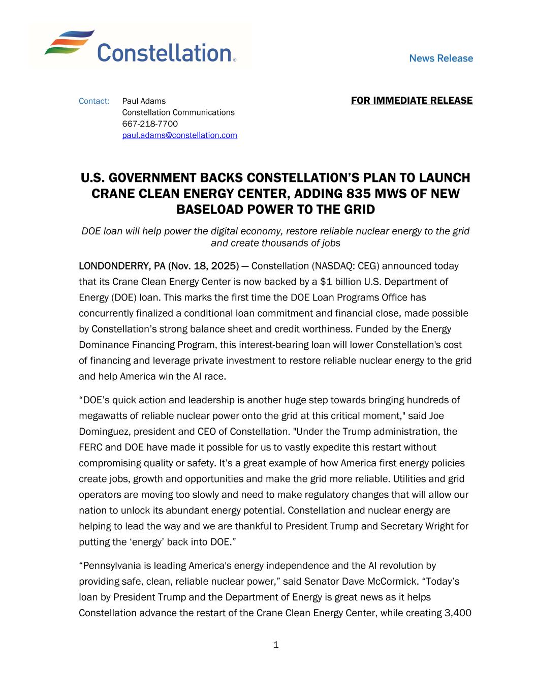 1 Contact: Paul Adams Constellation Communications 667-218-7700 paul.adams@constellation.com FOR IMMEDIATE RELEASE U.S. GOVERNMENT BACKS CONSTELLATION’S PLAN TO LAUNCH CRANE CLEAN ENERGY CENTER, ADDING 835 MWS OF NEW BASELOAD POWER TO THE GRID DOE loan will help power the digital economy, restore reliable nuclear energy to the grid and create thousands of jobs LONDONDERRY, PA (Nov. 18, 2025) — Constellation (NASDAQ: CEG) announced today that its Crane Clean Energy Center is now backed by a $1 billion U.S. Department of Energy (DOE) loan. This marks the first time the DOE Loan Programs Office has concurrently finalized a conditional loan commitment and financial close, made possible by Constellation’s strong balance sheet and credit worthiness. Funded by the Energy Dominance Financing Program, this interest-bearing loan will lower Constellation's cost of financing and leverage private investment to restore reliable nuclear energy to the grid and help America win the AI race. “DOE’s quick action and leadership is another huge step towards bringing hundreds of megawatts of reliable nuclear power onto the grid at this critical moment," said Joe Dominguez, president and CEO of Constellation. "Under the Trump administration, the FERC and DOE have made it possible for us to vastly expedite this restart without compromising quality or safety. It’s a great example of how America first energy policies create jobs, growth and opportunities and make the grid more reliable. Utilities and grid operators are moving too slowly and need to make regulatory changes that will allow our nation to unlock its abundant energy potential. Constellation and nuclear energy are helping to lead the way and we are thankful to President Trump and Secretary Wright for putting the ‘energy’ back into DOE.” “Pennsylvania is leading America's energy independence and the AI revolution by providing safe, clean, reliable nuclear power,” said Senator Dave McCormick. “Today’s loan by President Trump and the Department of Energy is great news as it helps Constellation advance the restart of the Crane Clean Energy Center, while creating 3,400