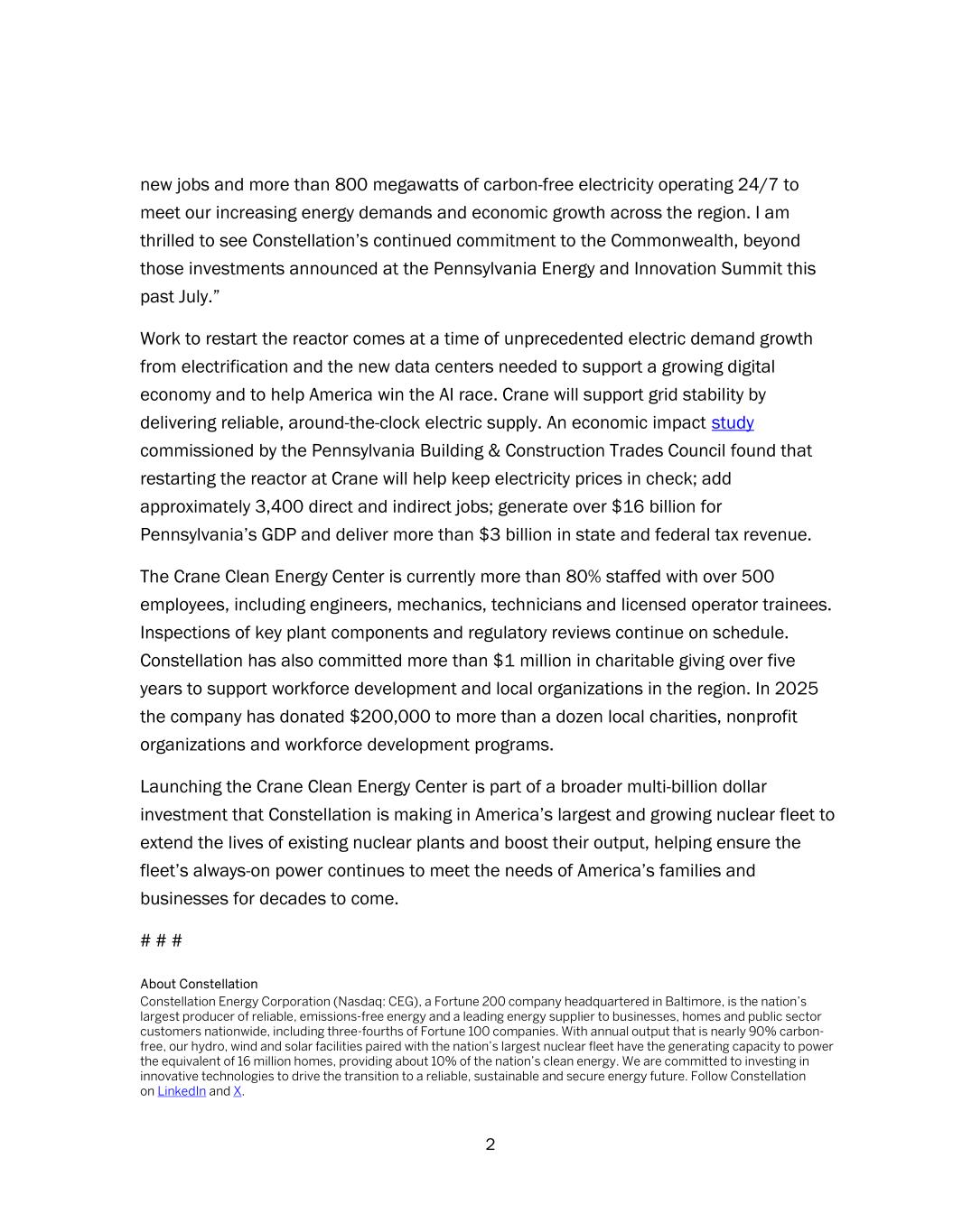 2 new jobs and more than 800 megawatts of carbon-free electricity operating 24/7 to meet our increasing energy demands and economic growth across the region. I am thrilled to see Constellation’s continued commitment to the Commonwealth, beyond those investments announced at the Pennsylvania Energy and Innovation Summit this past July.” Work to restart the reactor comes at a time of unprecedented electric demand growth from electrification and the new data centers needed to support a growing digital economy and to help America win the AI race. Crane will support grid stability by delivering reliable, around-the-clock electric supply. An economic impact study commissioned by the Pennsylvania Building & Construction Trades Council found that restarting the reactor at Crane will help keep electricity prices in check; add approximately 3,400 direct and indirect jobs; generate over $16 billion for Pennsylvania’s GDP and deliver more than $3 billion in state and federal tax revenue. The Crane Clean Energy Center is currently more than 80% staffed with over 500 employees, including engineers, mechanics, technicians and licensed operator trainees. Inspections of key plant components and regulatory reviews continue on schedule. Constellation has also committed more than $1 million in charitable giving over five years to support workforce development and local organizations in the region. In 2025 the company has donated $200,000 to more than a dozen local charities, nonprofit organizations and workforce development programs. Launching the Crane Clean Energy Center is part of a broader multi-billion dollar investment that Constellation is making in America’s largest and growing nuclear fleet to extend the lives of existing nuclear plants and boost their output, helping ensure the fleet’s always-on power continues to meet the needs of America’s families and businesses for decades to come. # # #