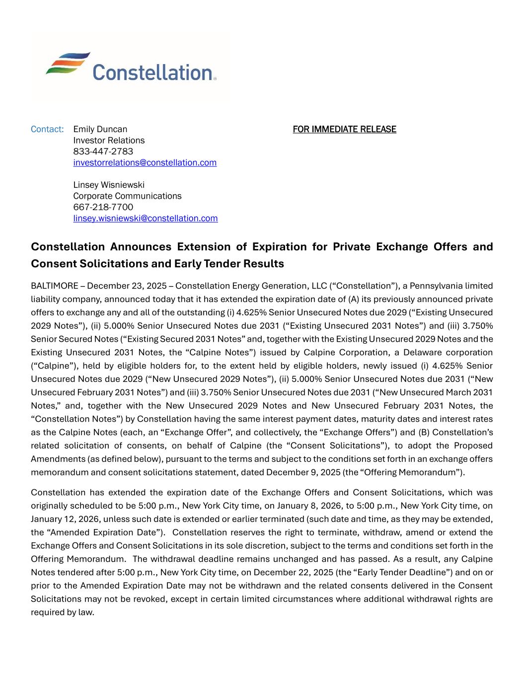 Contact: Emily Duncan Investor Relations 833-447-2783 investorrelations@constellation.com Linsey Wisniewski Corporate Communications 667-218-7700 linsey.wisniewski@constellation.com FOR IMMEDIATE RELEASE Constellation Announces Extension of Expiration for Private Exchange Offers and Consent Solicitations and Early Tender Results BALTIMORE – December 23, 2025 – Constellation Energy Generation, LLC (“Constellation”), a Pennsylvania limited liability company, announced today that it has extended the expiration date of (A) its previously announced private offers to exchange any and all of the outstanding (i) 4.625% Senior Unsecured Notes due 2029 (“Existing Unsecured 2029 Notes”), (ii) 5.000% Senior Unsecured Notes due 2031 (“Existing Unsecured 2031 Notes”) and (iii) 3.750% Senior Secured Notes (“Existing Secured 2031 Notes” and, together with the Existing Unsecured 2029 Notes and the Existing Unsecured 2031 Notes, the “Calpine Notes”) issued by Calpine Corporation, a Delaware corporation (“Calpine”), held by eligible holders for, to the extent held by eligible holders, newly issued (i) 4.625% Senior Unsecured Notes due 2029 (“New Unsecured 2029 Notes”), (ii) 5.000% Senior Unsecured Notes due 2031 (“New Unsecured February 2031 Notes”) and (iii) 3.750% Senior Unsecured Notes due 2031 (“New Unsecured March 2031 Notes,” and, together with the New Unsecured 2029 Notes and New Unsecured February 2031 Notes, the “Constellation Notes”) by Constellation having the same interest payment dates, maturity dates and interest rates as the Calpine Notes (each, an “Exchange Offer”, and collectively, the “Exchange Offers”) and (B) Constellation’s related solicitation of consents, on behalf of Calpine (the “Consent Solicitations”), to adopt the Proposed Amendments (as defined below), pursuant to the terms and subject to the conditions set forth in an exchange offers memorandum and consent solicitations statement, dated December 9, 2025 (the “Offering Memorandum”). Constellation has extended the expiration date of the Exchange Offers and Consent Solicitations, which was originally scheduled to be 5:00 p.m., New York City time, on January 8, 2026, to 5:00 p.m., New York City time, on January 12, 2026, unless such date is extended or earlier terminated (such date and time, as they may be extended, the “Amended Expiration Date”). Constellation reserves the right to terminate, withdraw, amend or extend the Exchange Offers and Consent Solicitations in its sole discretion, subject to the terms and conditions set forth in the Offering Memorandum. The withdrawal deadline remains unchanged and has passed. As a result, any Calpine Notes tendered after 5:00 p.m., New York City time, on December 22, 2025 (the “Early Tender Deadline”) and on or prior to the Amended Expiration Date may not be withdrawn and the related consents delivered in the Consent Solicitations may not be revoked, except in certain limited circumstances where additional withdrawal rights are required by law.