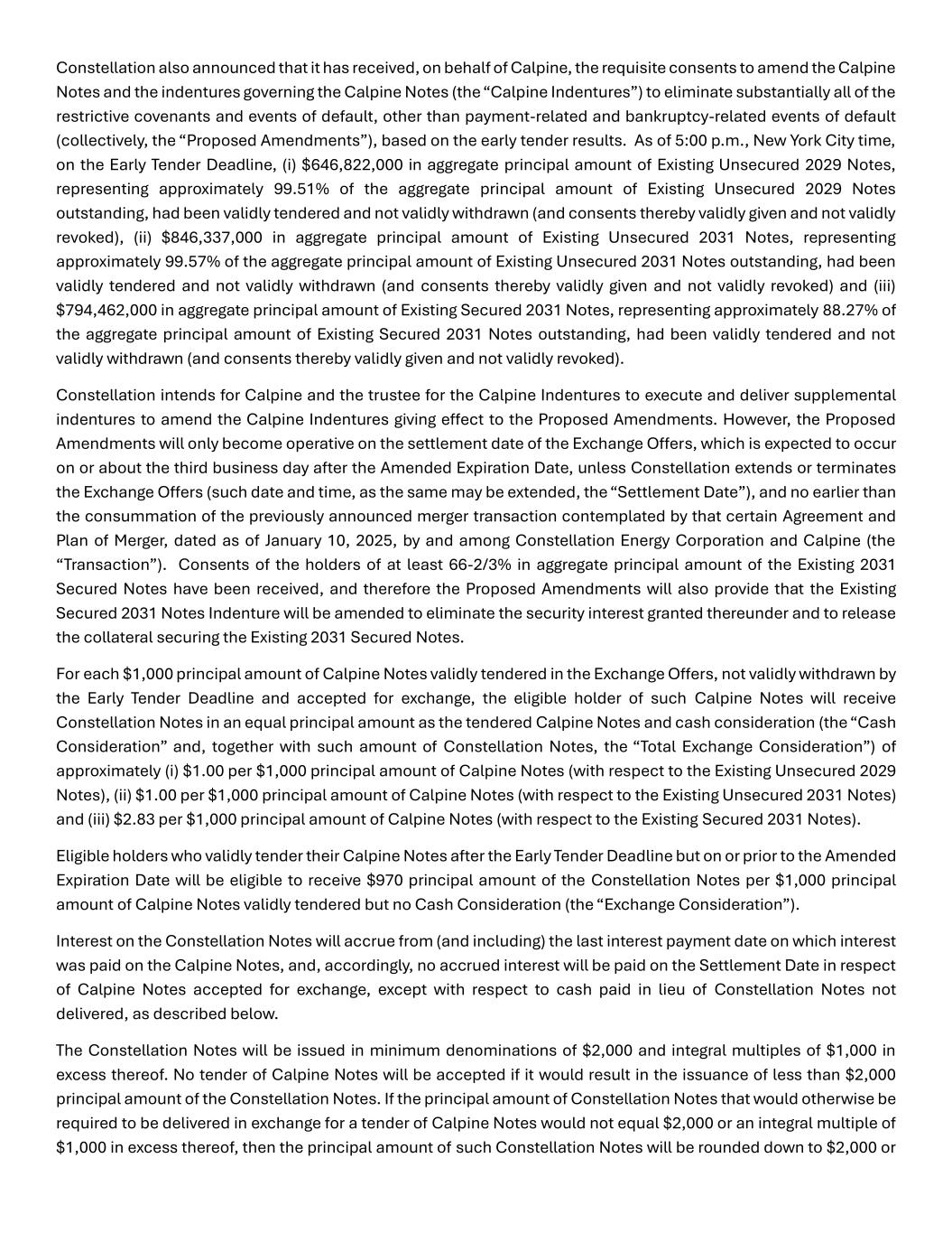 Constellation also announced that it has received, on behalf of Calpine, the requisite consents to amend the Calpine Notes and the indentures governing the Calpine Notes (the “Calpine Indentures”) to eliminate substantially all of the restrictive covenants and events of default, other than payment-related and bankruptcy-related events of default (collectively, the “Proposed Amendments”), based on the early tender results. As of 5:00 p.m., New York City time, on the Early Tender Deadline, (i) $646,822,000 in aggregate principal amount of Existing Unsecured 2029 Notes, representing approximately 99.51% of the aggregate principal amount of Existing Unsecured 2029 Notes outstanding, had been validly tendered and not validly withdrawn (and consents thereby validly given and not validly revoked), (ii) $846,337,000 in aggregate principal amount of Existing Unsecured 2031 Notes, representing approximately 99.57% of the aggregate principal amount of Existing Unsecured 2031 Notes outstanding, had been validly tendered and not validly withdrawn (and consents thereby validly given and not validly revoked) and (iii) $794,462,000 in aggregate principal amount of Existing Secured 2031 Notes, representing approximately 88.27% of the aggregate principal amount of Existing Secured 2031 Notes outstanding, had been validly tendered and not validly withdrawn (and consents thereby validly given and not validly revoked). Constellation intends for Calpine and the trustee for the Calpine Indentures to execute and deliver supplemental indentures to amend the Calpine Indentures giving effect to the Proposed Amendments. However, the Proposed Amendments will only become operative on the settlement date of the Exchange Offers, which is expected to occur on or about the third business day after the Amended Expiration Date, unless Constellation extends or terminates the Exchange Offers (such date and time, as the same may be extended, the “Settlement Date”), and no earlier than the consummation of the previously announced merger transaction contemplated by that certain Agreement and Plan of Merger, dated as of January 10, 2025, by and among Constellation Energy Corporation and Calpine (the “Transaction”). Consents of the holders of at least 66-2/3% in aggregate principal amount of the Existing 2031 Secured Notes have been received, and therefore the Proposed Amendments will also provide that the Existing Secured 2031 Notes Indenture will be amended to eliminate the security interest granted thereunder and to release the collateral securing the Existing 2031 Secured Notes. For each $1,000 principal amount of Calpine Notes validly tendered in the Exchange Offers, not validly withdrawn by the Early Tender Deadline and accepted for exchange, the eligible holder of such Calpine Notes will receive Constellation Notes in an equal principal amount as the tendered Calpine Notes and cash consideration (the “Cash Consideration” and, together with such amount of Constellation Notes, the “Total Exchange Consideration”) of approximately (i) $1.00 per $1,000 principal amount of Calpine Notes (with respect to the Existing Unsecured 2029 Notes), (ii) $1.00 per $1,000 principal amount of Calpine Notes (with respect to the Existing Unsecured 2031 Notes) and (iii) $2.83 per $1,000 principal amount of Calpine Notes (with respect to the Existing Secured 2031 Notes). Eligible holders who validly tender their Calpine Notes after the Early Tender Deadline but on or prior to the Amended Expiration Date will be eligible to receive $970 principal amount of the Constellation Notes per $1,000 principal amount of Calpine Notes validly tendered but no Cash Consideration (the “Exchange Consideration”). Interest on the Constellation Notes will accrue from (and including) the last interest payment date on which interest was paid on the Calpine Notes, and, accordingly, no accrued interest will be paid on the Settlement Date in respect of Calpine Notes accepted for exchange, except with respect to cash paid in lieu of Constellation Notes not delivered, as described below. The Constellation Notes will be issued in minimum denominations of $2,000 and integral multiples of $1,000 in excess thereof. No tender of Calpine Notes will be accepted if it would result in the issuance of less than $2,000 principal amount of the Constellation Notes. If the principal amount of Constellation Notes that would otherwise be required to be delivered in exchange for a tender of Calpine Notes would not equal $2,000 or an integral multiple of $1,000 in excess thereof, then the principal amount of such Constellation Notes will be rounded down to $2,000 or