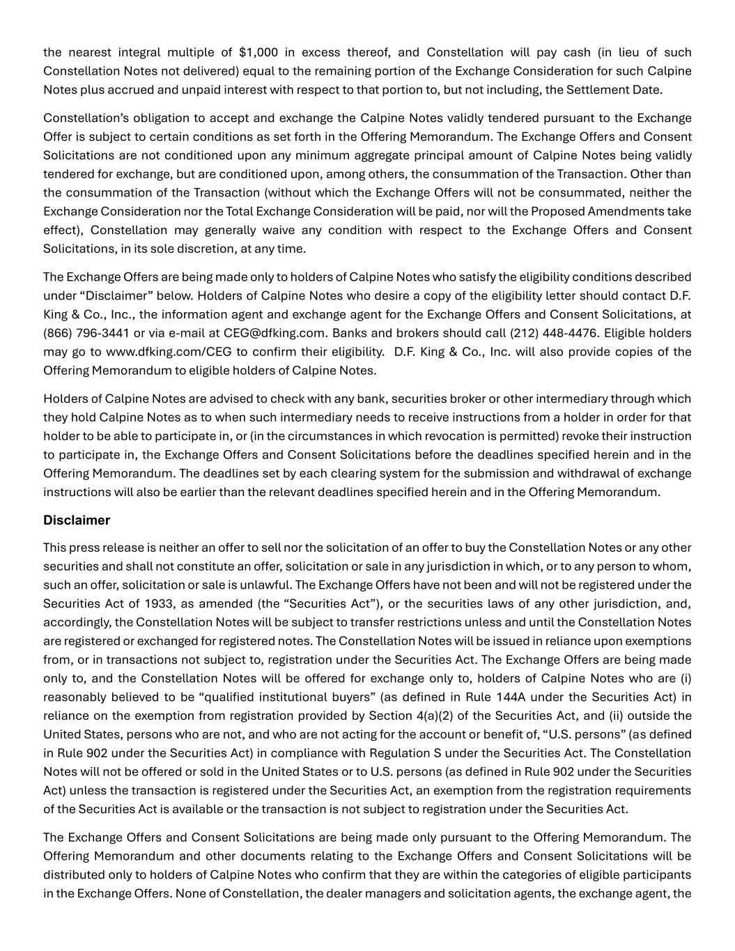 the nearest integral multiple of $1,000 in excess thereof, and Constellation will pay cash (in lieu of such Constellation Notes not delivered) equal to the remaining portion of the Exchange Consideration for such Calpine Notes plus accrued and unpaid interest with respect to that portion to, but not including, the Settlement Date. Constellation’s obligation to accept and exchange the Calpine Notes validly tendered pursuant to the Exchange Offer is subject to certain conditions as set forth in the Offering Memorandum. The Exchange Offers and Consent Solicitations are not conditioned upon any minimum aggregate principal amount of Calpine Notes being validly tendered for exchange, but are conditioned upon, among others, the consummation of the Transaction. Other than the consummation of the Transaction (without which the Exchange Offers will not be consummated, neither the Exchange Consideration nor the Total Exchange Consideration will be paid, nor will the Proposed Amendments take effect), Constellation may generally waive any condition with respect to the Exchange Offers and Consent Solicitations, in its sole discretion, at any time. The Exchange Offers are being made only to holders of Calpine Notes who satisfy the eligibility conditions described under “Disclaimer” below. Holders of Calpine Notes who desire a copy of the eligibility letter should contact D.F. King & Co., Inc., the information agent and exchange agent for the Exchange Offers and Consent Solicitations, at (866) 796-3441 or via e-mail at CEG@dfking.com. Banks and brokers should call (212) 448-4476. Eligible holders may go to www.dfking.com/CEG to confirm their eligibility. D.F. King & Co., Inc. will also provide copies of the Offering Memorandum to eligible holders of Calpine Notes. Holders of Calpine Notes are advised to check with any bank, securities broker or other intermediary through which they hold Calpine Notes as to when such intermediary needs to receive instructions from a holder in order for that holder to be able to participate in, or (in the circumstances in which revocation is permitted) revoke their instruction to participate in, the Exchange Offers and Consent Solicitations before the deadlines specified herein and in the Offering Memorandum. The deadlines set by each clearing system for the submission and withdrawal of exchange instructions will also be earlier than the relevant deadlines specified herein and in the Offering Memorandum. Disclaimer This press release is neither an offer to sell nor the solicitation of an offer to buy the Constellation Notes or any other securities and shall not constitute an offer, solicitation or sale in any jurisdiction in which, or to any person to whom, such an offer, solicitation or sale is unlawful. The Exchange Offers have not been and will not be registered under the Securities Act of 1933, as amended (the “Securities Act”), or the securities laws of any other jurisdiction, and, accordingly, the Constellation Notes will be subject to transfer restrictions unless and until the Constellation Notes are registered or exchanged for registered notes. The Constellation Notes will be issued in reliance upon exemptions from, or in transactions not subject to, registration under the Securities Act. The Exchange Offers are being made only to, and the Constellation Notes will be offered for exchange only to, holders of Calpine Notes who are (i) reasonably believed to be “qualified institutional buyers” (as defined in Rule 144A under the Securities Act) in reliance on the exemption from registration provided by Section 4(a)(2) of the Securities Act, and (ii) outside the United States, persons who are not, and who are not acting for the account or benefit of, “U.S. persons” (as defined in Rule 902 under the Securities Act) in compliance with Regulation S under the Securities Act. The Constellation Notes will not be offered or sold in the United States or to U.S. persons (as defined in Rule 902 under the Securities Act) unless the transaction is registered under the Securities Act, an exemption from the registration requirements of the Securities Act is available or the transaction is not subject to registration under the Securities Act. The Exchange Offers and Consent Solicitations are being made only pursuant to the Offering Memorandum. The Offering Memorandum and other documents relating to the Exchange Offers and Consent Solicitations will be distributed only to holders of Calpine Notes who confirm that they are within the categories of eligible participants in the Exchange Offers. None of Constellation, the dealer managers and solicitation agents, the exchange agent, the