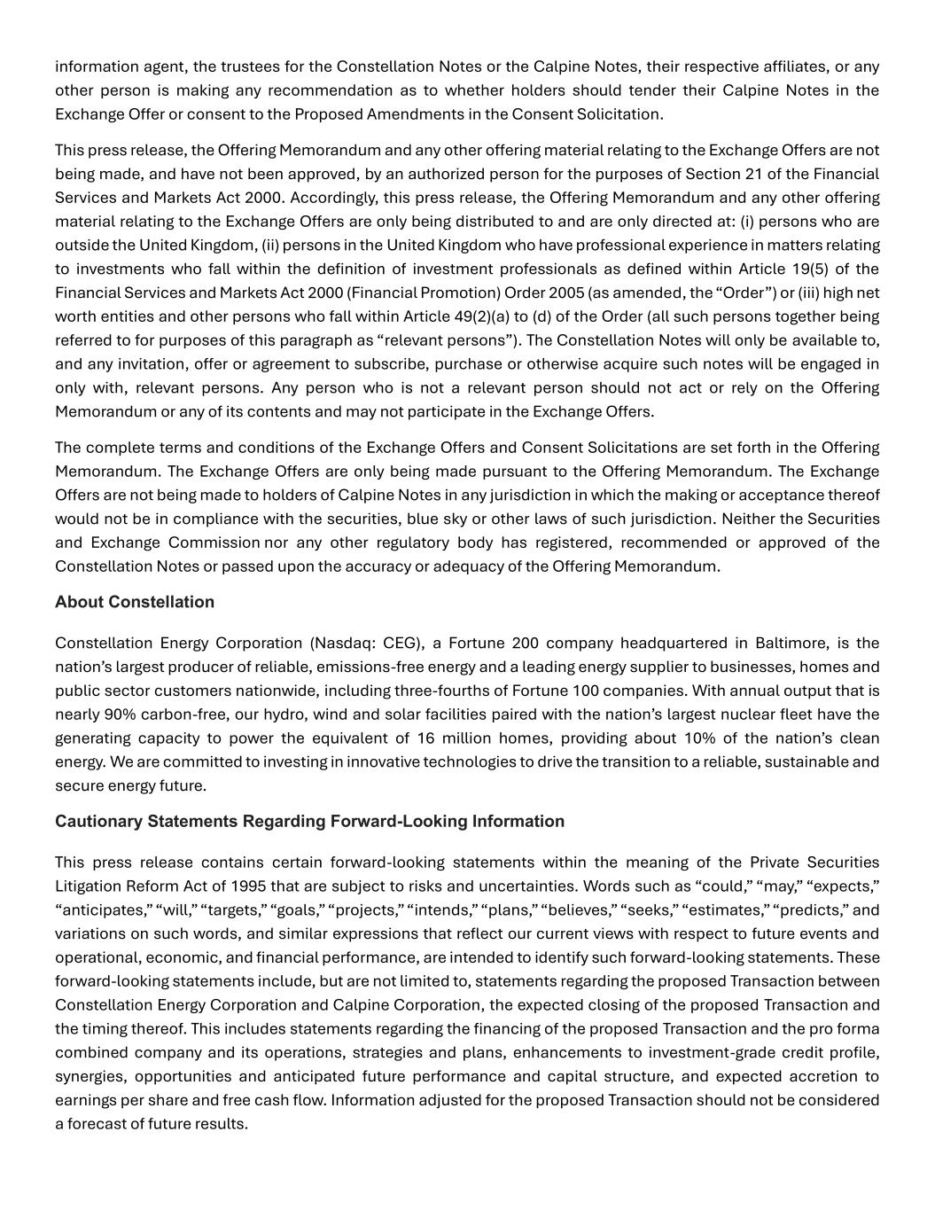 information agent, the trustees for the Constellation Notes or the Calpine Notes, their respective affiliates, or any other person is making any recommendation as to whether holders should tender their Calpine Notes in the Exchange Offer or consent to the Proposed Amendments in the Consent Solicitation. This press release, the Offering Memorandum and any other offering material relating to the Exchange Offers are not being made, and have not been approved, by an authorized person for the purposes of Section 21 of the Financial Services and Markets Act 2000. Accordingly, this press release, the Offering Memorandum and any other offering material relating to the Exchange Offers are only being distributed to and are only directed at: (i) persons who are outside the United Kingdom, (ii) persons in the United Kingdom who have professional experience in matters relating to investments who fall within the definition of investment professionals as defined within Article 19(5) of the Financial Services and Markets Act 2000 (Financial Promotion) Order 2005 (as amended, the “Order”) or (iii) high net worth entities and other persons who fall within Article 49(2)(a) to (d) of the Order (all such persons together being referred to for purposes of this paragraph as “relevant persons”). The Constellation Notes will only be available to, and any invitation, offer or agreement to subscribe, purchase or otherwise acquire such notes will be engaged in only with, relevant persons. Any person who is not a relevant person should not act or rely on the Offering Memorandum or any of its contents and may not participate in the Exchange Offers. The complete terms and conditions of the Exchange Offers and Consent Solicitations are set forth in the Offering Memorandum. The Exchange Offers are only being made pursuant to the Offering Memorandum. The Exchange Offers are not being made to holders of Calpine Notes in any jurisdiction in which the making or acceptance thereof would not be in compliance with the securities, blue sky or other laws of such jurisdiction. Neither the Securities and Exchange Commission nor any other regulatory body has registered, recommended or approved of the Constellation Notes or passed upon the accuracy or adequacy of the Offering Memorandum. About Constellation Constellation Energy Corporation (Nasdaq: CEG), a Fortune 200 company headquartered in Baltimore, is the nation’s largest producer of reliable, emissions-free energy and a leading energy supplier to businesses, homes and public sector customers nationwide, including three-fourths of Fortune 100 companies. With annual output that is nearly 90% carbon-free, our hydro, wind and solar facilities paired with the nation’s largest nuclear fleet have the generating capacity to power the equivalent of 16 million homes, providing about 10% of the nation’s clean energy. We are committed to investing in innovative technologies to drive the transition to a reliable, sustainable and secure energy future. Cautionary Statements Regarding Forward-Looking Information This press release contains certain forward-looking statements within the meaning of the Private Securities Litigation Reform Act of 1995 that are subject to risks and uncertainties. Words such as “could,” “may,” “expects,” “anticipates,” “will,” “targets,” “goals,” “projects,” “intends,” “plans,” “believes,” “seeks,” “estimates,” “predicts,” and variations on such words, and similar expressions that reflect our current views with respect to future events and operational, economic, and financial performance, are intended to identify such forward-looking statements. These forward-looking statements include, but are not limited to, statements regarding the proposed Transaction between Constellation Energy Corporation and Calpine Corporation, the expected closing of the proposed Transaction and the timing thereof. This includes statements regarding the financing of the proposed Transaction and the pro forma combined company and its operations, strategies and plans, enhancements to investment-grade credit profile, synergies, opportunities and anticipated future performance and capital structure, and expected accretion to earnings per share and free cash flow. Information adjusted for the proposed Transaction should not be considered a forecast of future results.