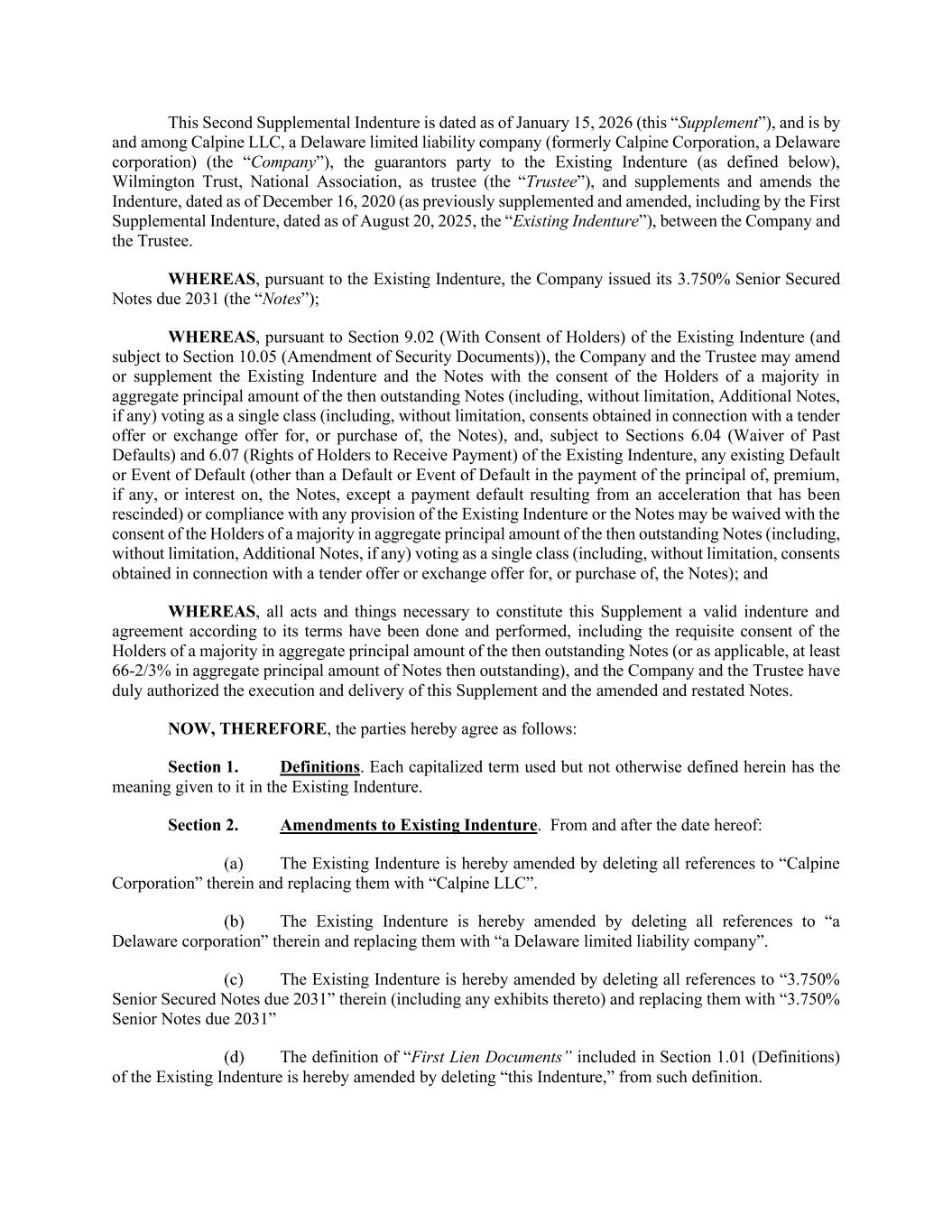 This Second Supplemental Indenture is dated as of January 15, 2026 (this “Supplement”), and is by and among Calpine LLC, a Delaware limited liability company (formerly Calpine Corporation, a Delaware corporation) (the “Company”), the guarantors party to the Existing Indenture (as defined below), Wilmington Trust, National Association, as trustee (the “Trustee”), and supplements and amends the Indenture, dated as of December 16, 2020 (as previously supplemented and amended, including by the First Supplemental Indenture, dated as of August 20, 2025, the “Existing Indenture”), between the Company and the Trustee. WHEREAS, pursuant to the Existing Indenture, the Company issued its 3.750% Senior Secured Notes due 2031 (the “Notes”); WHEREAS, pursuant to Section 9.02 (With Consent of Holders) of the Existing Indenture (and subject to Section 10.05 (Amendment of Security Documents)), the Company and the Trustee may amend or supplement the Existing Indenture and the Notes with the consent of the Holders of a majority in aggregate principal amount of the then outstanding Notes (including, without limitation, Additional Notes, if any) voting as a single class (including, without limitation, consents obtained in connection with a tender offer or exchange offer for, or purchase of, the Notes), and, subject to Sections 6.04 (Waiver of Past Defaults) and 6.07 (Rights of Holders to Receive Payment) of the Existing Indenture, any existing Default or Event of Default (other than a Default or Event of Default in the payment of the principal of, premium, if any, or interest on, the Notes, except a payment default resulting from an acceleration that has been rescinded) or compliance with any provision of the Existing Indenture or the Notes may be waived with the consent of the Holders of a majority in aggregate principal amount of the then outstanding Notes (including, without limitation, Additional Notes, if any) voting as a single class (including, without limitation, consents obtained in connection with a tender offer or exchange offer for, or purchase of, the Notes); and WHEREAS, all acts and things necessary to constitute this Supplement a valid indenture and agreement according to its terms have been done and performed, including the requisite consent of the Holders of a majority in aggregate principal amount of the then outstanding Notes (or as applicable, at least 66-2/3% in aggregate principal amount of Notes then outstanding), and the Company and the Trustee have duly authorized the execution and delivery of this Supplement and the amended and restated Notes. NOW, THEREFORE, the parties hereby agree as follows: Section 1. Definitions. Each capitalized term used but not otherwise defined herein has the meaning given to it in the Existing Indenture. Section 2. Amendments to Existing Indenture. From and after the date hereof: The Existing Indenture is hereby amended by deleting all references to “Calpine Corporation” therein and replacing them with “Calpine LLC”. The Existing Indenture is hereby amended by deleting all references to “a Delaware corporation” therein and replacing them with “a Delaware limited liability company”. The Existing Indenture is hereby amended by deleting all references to “3.750% Senior Secured Notes due 2031” therein (including any exhibits thereto) and replacing them with “3.750% Senior Notes due 2031” The definition of “First Lien Documents” included in Section 1.01 (Definitions) of the Existing Indenture is hereby amended by deleting “this Indenture,” from such definition.