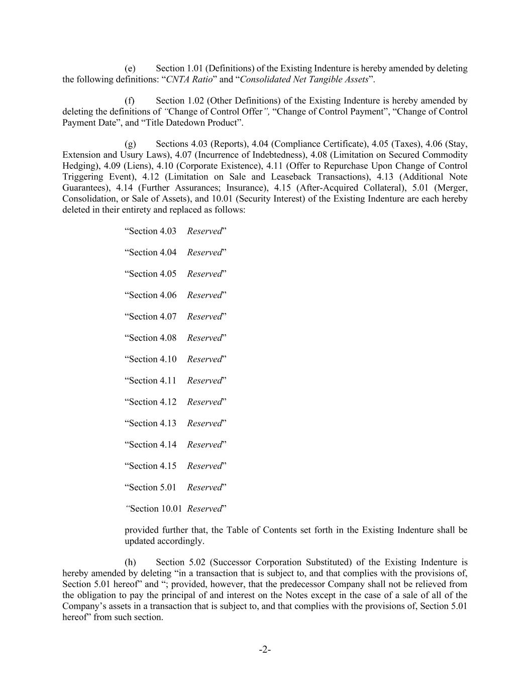 -2- Section 1.01 (Definitions) of the Existing Indenture is hereby amended by deleting the following definitions: “CNTA Ratio” and “Consolidated Net Tangible Assets”. Section 1.02 (Other Definitions) of the Existing Indenture is hereby amended by deleting the definitions of “Change of Control Offer”, “Change of Control Payment”, “Change of Control Payment Date”, and “Title Datedown Product”. Sections 4.03 (Reports), 4.04 (Compliance Certificate), 4.05 (Taxes), 4.06 (Stay, Extension and Usury Laws), 4.07 (Incurrence of Indebtedness), 4.08 (Limitation on Secured Commodity Hedging), 4.09 (Liens), 4.10 (Corporate Existence), 4.11 (Offer to Repurchase Upon Change of Control Triggering Event), 4.12 (Limitation on Sale and Leaseback Transactions), 4.13 (Additional Note Guarantees), 4.14 (Further Assurances; Insurance), 4.15 (After-Acquired Collateral), 5.01 (Merger, Consolidation, or Sale of Assets), and 10.01 (Security Interest) of the Existing Indenture are each hereby deleted in their entirety and replaced as follows: “Section 4.03 Reserved” “Section 4.04 Reserved” “Section 4.05 Reserved” “Section 4.06 Reserved” “Section 4.07 Reserved” “Section 4.08 Reserved” “Section 4.10 Reserved” “Section 4.11 Reserved” “Section 4.12 Reserved” “Section 4.13 Reserved” “Section 4.14 Reserved” “Section 4.15 Reserved” “Section 5.01 Reserved” “Section 10.01 Reserved” provided further that, the Table of Contents set forth in the Existing Indenture shall be updated accordingly. Section 5.02 (Successor Corporation Substituted) of the Existing Indenture is hereby amended by deleting “in a transaction that is subject to, and that complies with the provisions of, Section 5.01 hereof” and “; provided, however, that the predecessor Company shall not be relieved from the obligation to pay the principal of and interest on the Notes except in the case of a sale of all of the Company’s assets in a transaction that is subject to, and that complies with the provisions of, Section 5.01 hereof” from such section.