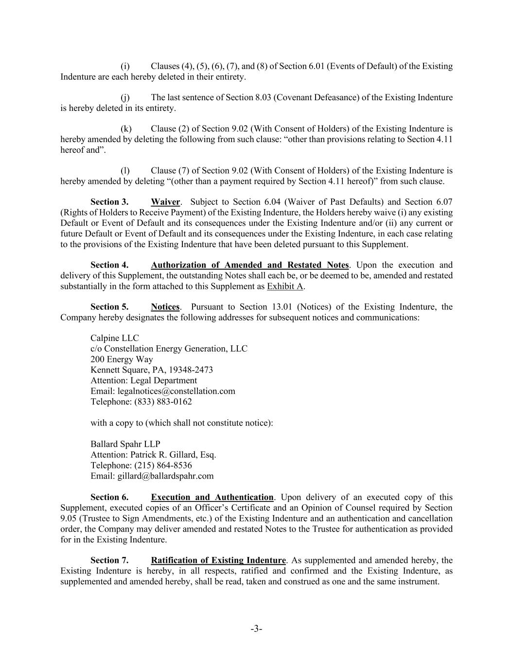 -3- Clauses (4), (5), (6), (7), and (8) of Section 6.01 (Events of Default) of the Existing Indenture are each hereby deleted in their entirety. The last sentence of Section 8.03 (Covenant Defeasance) of the Existing Indenture is hereby deleted in its entirety. Clause (2) of Section 9.02 (With Consent of Holders) of the Existing Indenture is hereby amended by deleting the following from such clause: “other than provisions relating to Section 4.11 hereof and”. Clause (7) of Section 9.02 (With Consent of Holders) of the Existing Indenture is hereby amended by deleting “(other than a payment required by Section 4.11 hereof)” from such clause. Section 3. Waiver. Subject to Section 6.04 (Waiver of Past Defaults) and Section 6.07 (Rights of Holders to Receive Payment) of the Existing Indenture, the Holders hereby waive (i) any existing Default or Event of Default and its consequences under the Existing Indenture and/or (ii) any current or future Default or Event of Default and its consequences under the Existing Indenture, in each case relating to the provisions of the Existing Indenture that have been deleted pursuant to this Supplement. Section 4. Authorization of Amended and Restated Notes. Upon the execution and delivery of this Supplement, the outstanding Notes shall each be, or be deemed to be, amended and restated substantially in the form attached to this Supplement as Exhibit A. Section 5. Notices. Pursuant to Section 13.01 (Notices) of the Existing Indenture, the Company hereby designates the following addresses for subsequent notices and communications: Calpine LLC c/o Constellation Energy Generation, LLC 200 Energy Way Kennett Square, PA, 19348-2473 Attention: Legal Department Email: legalnotices@constellation.com Telephone: (833) 883-0162 with a copy to (which shall not constitute notice): Ballard Spahr LLP Attention: Patrick R. Gillard, Esq. Telephone: (215) 864-8536 Email: gillard@ballardspahr.com Section 6. Execution and Authentication. Upon delivery of an executed copy of this Supplement, executed copies of an Officer’s Certificate and an Opinion of Counsel required by Section 9.05 (Trustee to Sign Amendments, etc.) of the Existing Indenture and an authentication and cancellation order, the Company may deliver amended and restated Notes to the Trustee for authentication as provided for in the Existing Indenture. Section 7. Ratification of Existing Indenture. As supplemented and amended hereby, the Existing Indenture is hereby, in all respects, ratified and confirmed and the Existing Indenture, as supplemented and amended hereby, shall be read, taken and construed as one and the same instrument.