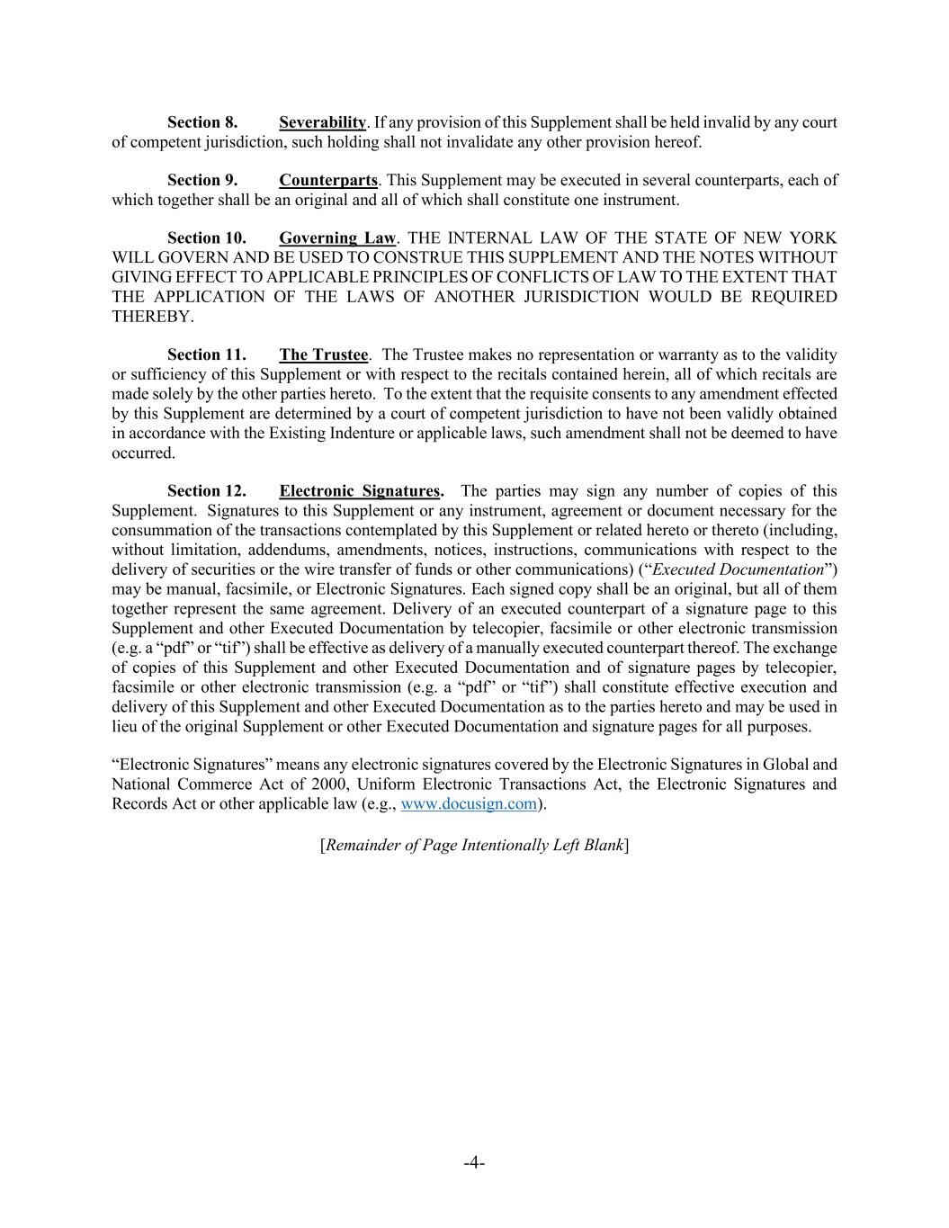 -4- Section 8. Severability. If any provision of this Supplement shall be held invalid by any court of competent jurisdiction, such holding shall not invalidate any other provision hereof. Section 9. Counterparts. This Supplement may be executed in several counterparts, each of which together shall be an original and all of which shall constitute one instrument. Section 10. Governing Law. THE INTERNAL LAW OF THE STATE OF NEW YORK WILL GOVERN AND BE USED TO CONSTRUE THIS SUPPLEMENT AND THE NOTES WITHOUT GIVING EFFECT TO APPLICABLE PRINCIPLES OF CONFLICTS OF LAW TO THE EXTENT THAT THE APPLICATION OF THE LAWS OF ANOTHER JURISDICTION WOULD BE REQUIRED THEREBY. Section 11. The Trustee. The Trustee makes no representation or warranty as to the validity or sufficiency of this Supplement or with respect to the recitals contained herein, all of which recitals are made solely by the other parties hereto. To the extent that the requisite consents to any amendment effected by this Supplement are determined by a court of competent jurisdiction to have not been validly obtained in accordance with the Existing Indenture or applicable laws, such amendment shall not be deemed to have occurred. Section 12. Electronic Signatures. The parties may sign any number of copies of this Supplement. Signatures to this Supplement or any instrument, agreement or document necessary for the consummation of the transactions contemplated by this Supplement or related hereto or thereto (including, without limitation, addendums, amendments, notices, instructions, communications with respect to the delivery of securities or the wire transfer of funds or other communications) (“Executed Documentation”) may be manual, facsimile, or Electronic Signatures. Each signed copy shall be an original, but all of them together represent the same agreement. Delivery of an executed counterpart of a signature page to this Supplement and other Executed Documentation by telecopier, facsimile or other electronic transmission (e.g. a “pdf” or “tif”) shall be effective as delivery of a manually executed counterpart thereof. The exchange of copies of this Supplement and other Executed Documentation and of signature pages by telecopier, facsimile or other electronic transmission (e.g. a “pdf” or “tif”) shall constitute effective execution and delivery of this Supplement and other Executed Documentation as to the parties hereto and may be used in lieu of the original Supplement or other Executed Documentation and signature pages for all purposes. “Electronic Signatures” means any electronic signatures covered by the Electronic Signatures in Global and National Commerce Act of 2000, Uniform Electronic Transactions Act, the Electronic Signatures and Records Act or other applicable law (e.g., www.docusign.com). [Remainder of Page Intentionally Left Blank]