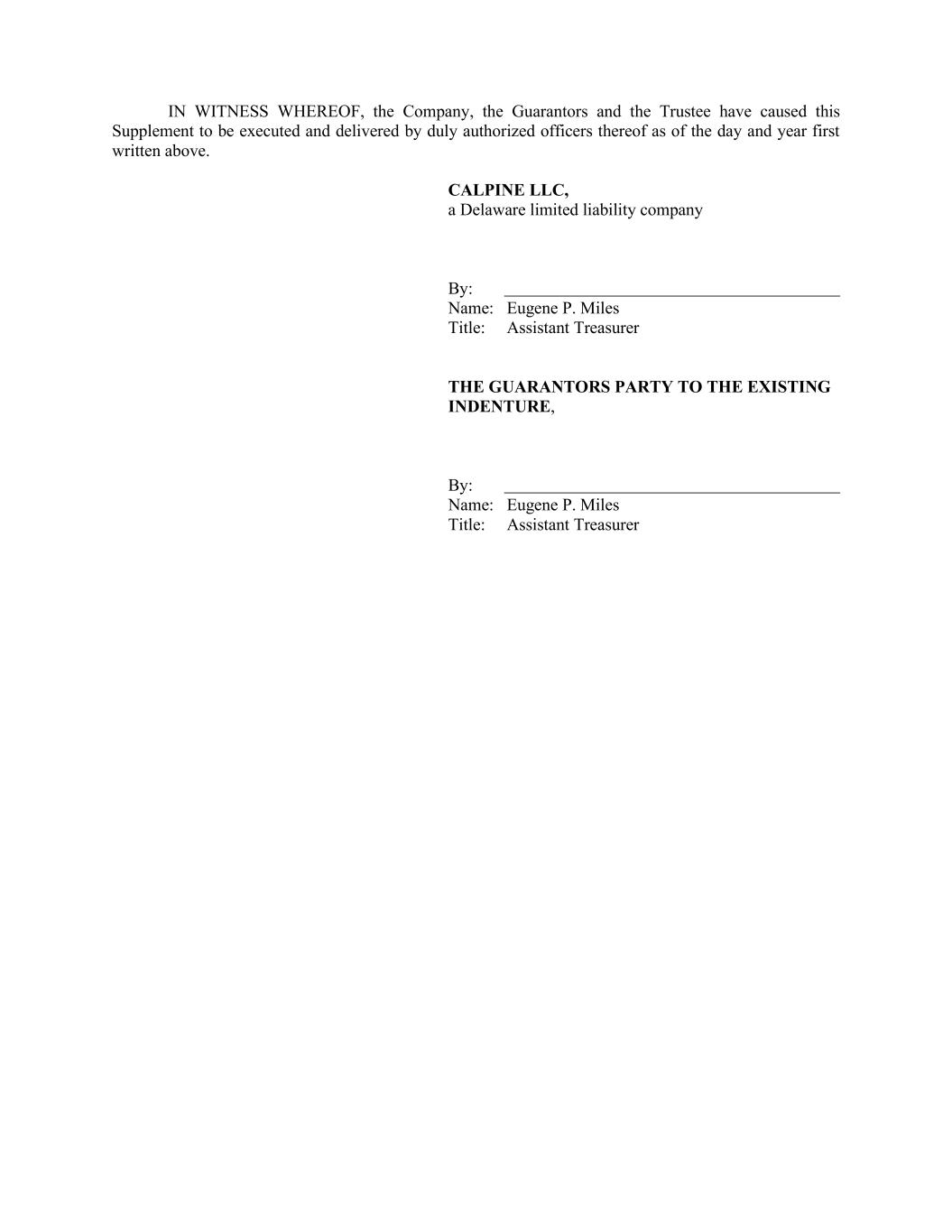 IN WITNESS WHEREOF, the Company, the Guarantors and the Trustee have caused this Supplement to be executed and delivered by duly authorized officers thereof as of the day and year first written above. CALPINE LLC, a Delaware limited liability company By: Name: Eugene P. Miles Title: Assistant Treasurer THE GUARANTORS PARTY TO THE EXISTING INDENTURE, By: Name: Eugene P. Miles Title: Assistant Treasurer