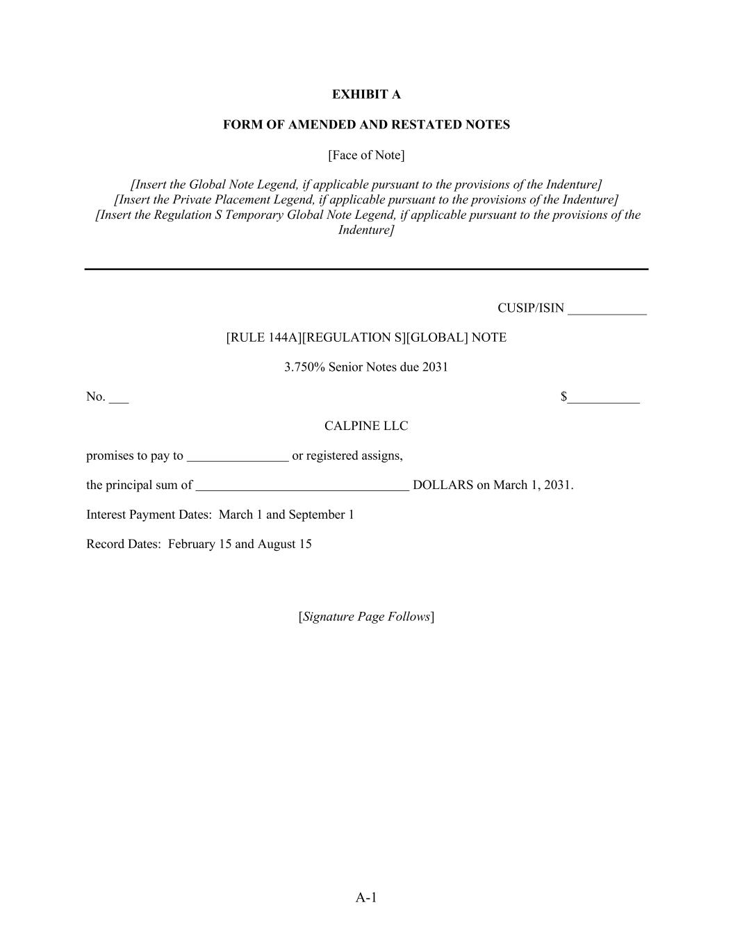 A-1 EXHIBIT A FORM OF AMENDED AND RESTATED NOTES [Face of Note] [Insert the Global Note Legend, if applicable pursuant to the provisions of the Indenture] [Insert the Private Placement Legend, if applicable pursuant to the provisions of the Indenture] [Insert the Regulation S Temporary Global Note Legend, if applicable pursuant to the provisions of the Indenture] CUSIP/ISIN ____________ [RULE 144A][REGULATION S][GLOBAL] NOTE 3.750% Senior Notes due 2031 No. ___ $___________ CALPINE LLC promises to pay to or registered assigns, the principal sum of DOLLARS on March 1, 2031. Interest Payment Dates: March 1 and September 1 Record Dates: February 15 and August 15 [Signature Page Follows]