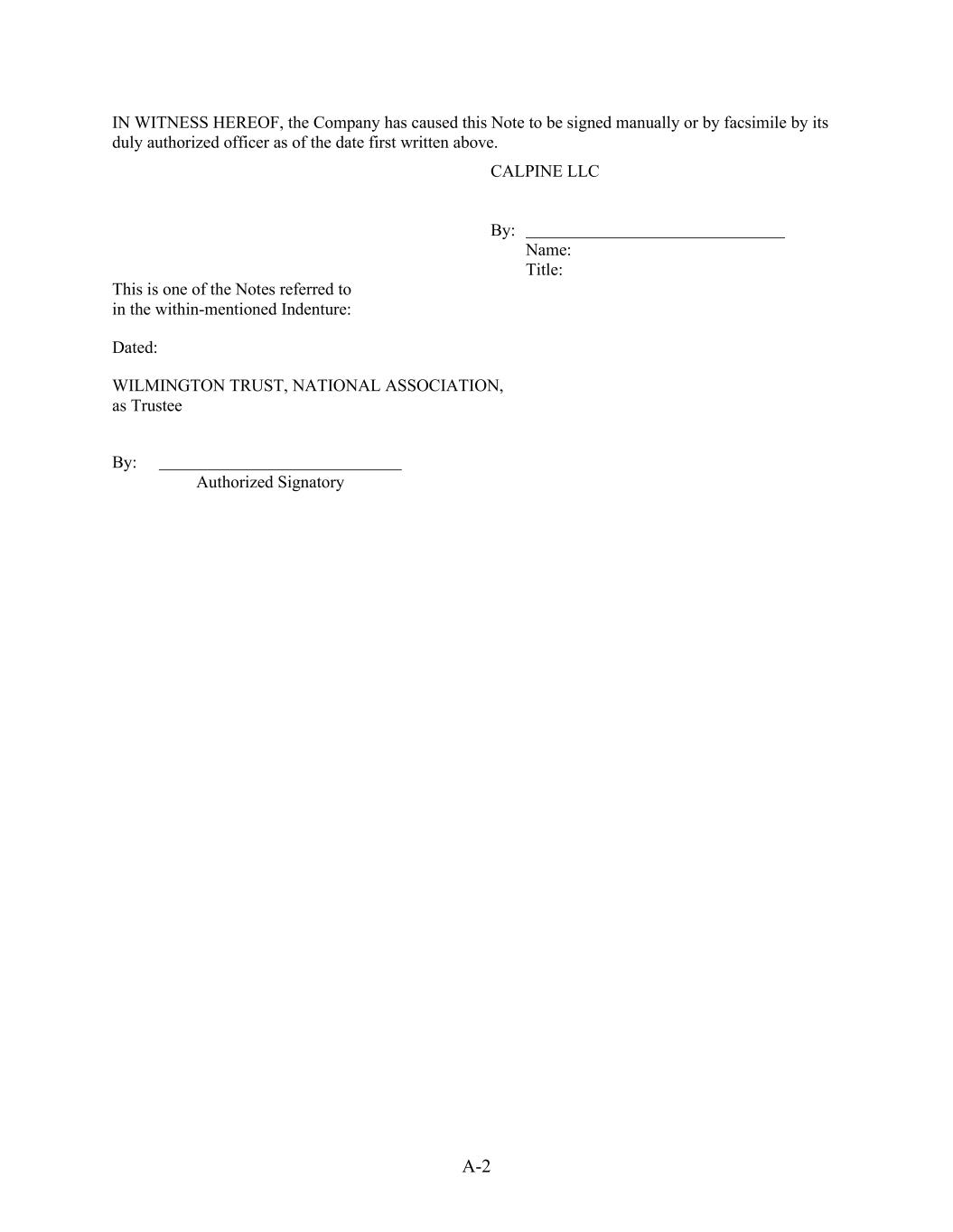 A-2 IN WITNESS HEREOF, the Company has caused this Note to be signed manually or by facsimile by its duly authorized officer as of the date first written above. CALPINE LLC By: Name: Title: This is one of the Notes referred to in the within-mentioned Indenture: Dated: WILMINGTON TRUST, NATIONAL ASSOCIATION, as Trustee By: Authorized Signatory