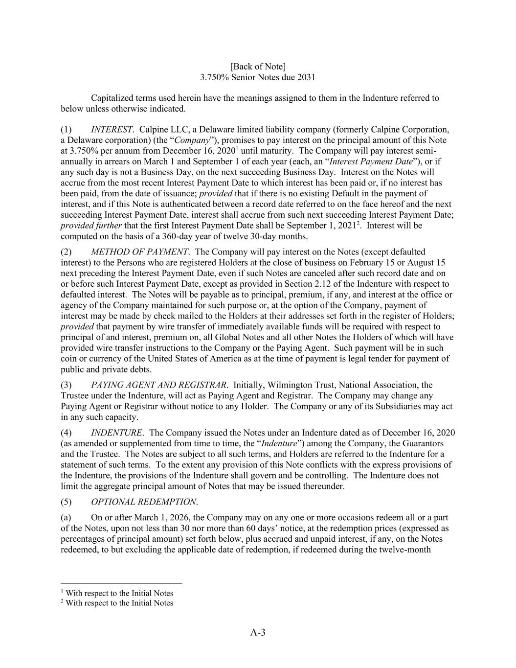 A-3 [Back of Note] 3.750% Senior Notes due 2031 Capitalized terms used herein have the meanings assigned to them in the Indenture referred to below unless otherwise indicated. (1) INTEREST. Calpine LLC, a Delaware limited liability company (formerly Calpine Corporation, a Delaware corporation) (the “Company”), promises to pay interest on the principal amount of this Note at 3.750% per annum from December 16, 20201 until maturity. The Company will pay interest semi- annually in arrears on March 1 and September 1 of each year (each, an “Interest Payment Date”), or if any such day is not a Business Day, on the next succeeding Business Day. Interest on the Notes will accrue from the most recent Interest Payment Date to which interest has been paid or, if no interest has been paid, from the date of issuance; provided that if there is no existing Default in the payment of interest, and if this Note is authenticated between a record date referred to on the face hereof and the next succeeding Interest Payment Date, interest shall accrue from such next succeeding Interest Payment Date; provided further that the first Interest Payment Date shall be September 1, 20212. Interest will be computed on the basis of a 360-day year of twelve 30-day months. (2) METHOD OF PAYMENT. The Company will pay interest on the Notes (except defaulted interest) to the Persons who are registered Holders at the close of business on February 15 or August 15 next preceding the Interest Payment Date, even if such Notes are canceled after such record date and on or before such Interest Payment Date, except as provided in Section 2.12 of the Indenture with respect to defaulted interest. The Notes will be payable as to principal, premium, if any, and interest at the office or agency of the Company maintained for such purpose or, at the option of the Company, payment of interest may be made by check mailed to the Holders at their addresses set forth in the register of Holders; provided that payment by wire transfer of immediately available funds will be required with respect to principal of and interest, premium on, all Global Notes and all other Notes the Holders of which will have provided wire transfer instructions to the Company or the Paying Agent. Such payment will be in such coin or currency of the United States of America as at the time of payment is legal tender for payment of public and private debts. (3) PAYING AGENT AND REGISTRAR. Initially, Wilmington Trust, National Association, the Trustee under the Indenture, will act as Paying Agent and Registrar. The Company may change any Paying Agent or Registrar without notice to any Holder. The Company or any of its Subsidiaries may act in any such capacity. (4) INDENTURE. The Company issued the Notes under an Indenture dated as of December 16, 2020 (as amended or supplemented from time to time, the “Indenture”) among the Company, the Guarantors and the Trustee. The Notes are subject to all such terms, and Holders are referred to the Indenture for a statement of such terms. To the extent any provision of this Note conflicts with the express provisions of the Indenture, the provisions of the Indenture shall govern and be controlling. The Indenture does not limit the aggregate principal amount of Notes that may be issued thereunder. (5) OPTIONAL REDEMPTION. (a) On or after March 1, 2026, the Company may on any one or more occasions redeem all or a part of the Notes, upon not less than 30 nor more than 60 days’ notice, at the redemption prices (expressed as percentages of principal amount) set forth below, plus accrued and unpaid interest, if any, on the Notes redeemed, to but excluding the applicable date of redemption, if redeemed during the twelve-month 1 With respect to the Initial Notes 2 With respect to the Initial Notes