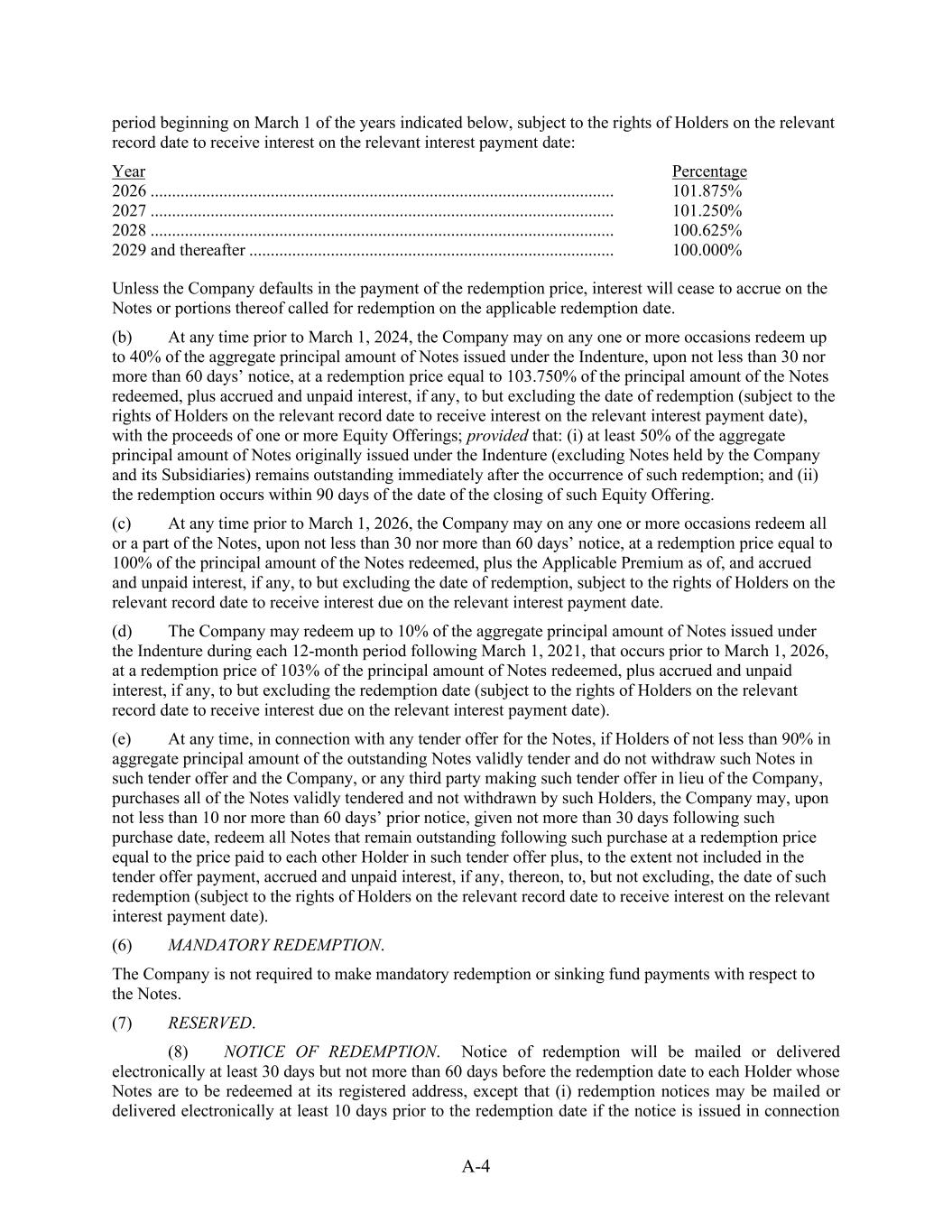 A-4 period beginning on March 1 of the years indicated below, subject to the rights of Holders on the relevant record date to receive interest on the relevant interest payment date: Year Percentage 2026 ............................................................................................................ 101.875% 2027 ............................................................................................................ 101.250% 2028 ............................................................................................................ 100.625% 2029 and thereafter ..................................................................................... 100.000% Unless the Company defaults in the payment of the redemption price, interest will cease to accrue on the Notes or portions thereof called for redemption on the applicable redemption date. (b) At any time prior to March 1, 2024, the Company may on any one or more occasions redeem up to 40% of the aggregate principal amount of Notes issued under the Indenture, upon not less than 30 nor more than 60 days’ notice, at a redemption price equal to 103.750% of the principal amount of the Notes redeemed, plus accrued and unpaid interest, if any, to but excluding the date of redemption (subject to the rights of Holders on the relevant record date to receive interest on the relevant interest payment date), with the proceeds of one or more Equity Offerings; provided that: (i) at least 50% of the aggregate principal amount of Notes originally issued under the Indenture (excluding Notes held by the Company and its Subsidiaries) remains outstanding immediately after the occurrence of such redemption; and (ii) the redemption occurs within 90 days of the date of the closing of such Equity Offering. (c) At any time prior to March 1, 2026, the Company may on any one or more occasions redeem all or a part of the Notes, upon not less than 30 nor more than 60 days’ notice, at a redemption price equal to 100% of the principal amount of the Notes redeemed, plus the Applicable Premium as of, and accrued and unpaid interest, if any, to but excluding the date of redemption, subject to the rights of Holders on the relevant record date to receive interest due on the relevant interest payment date. (d) The Company may redeem up to 10% of the aggregate principal amount of Notes issued under the Indenture during each 12-month period following March 1, 2021, that occurs prior to March 1, 2026, at a redemption price of 103% of the principal amount of Notes redeemed, plus accrued and unpaid interest, if any, to but excluding the redemption date (subject to the rights of Holders on the relevant record date to receive interest due on the relevant interest payment date). (e) At any time, in connection with any tender offer for the Notes, if Holders of not less than 90% in aggregate principal amount of the outstanding Notes validly tender and do not withdraw such Notes in such tender offer and the Company, or any third party making such tender offer in lieu of the Company, purchases all of the Notes validly tendered and not withdrawn by such Holders, the Company may, upon not less than 10 nor more than 60 days’ prior notice, given not more than 30 days following such purchase date, redeem all Notes that remain outstanding following such purchase at a redemption price equal to the price paid to each other Holder in such tender offer plus, to the extent not included in the tender offer payment, accrued and unpaid interest, if any, thereon, to, but not excluding, the date of such redemption (subject to the rights of Holders on the relevant record date to receive interest on the relevant interest payment date). (6) MANDATORY REDEMPTION. The Company is not required to make mandatory redemption or sinking fund payments with respect to the Notes. (7) RESERVED. (8) NOTICE OF REDEMPTION. Notice of redemption will be mailed or delivered electronically at least 30 days but not more than 60 days before the redemption date to each Holder whose Notes are to be redeemed at its registered address, except that (i) redemption notices may be mailed or delivered electronically at least 10 days prior to the redemption date if the notice is issued in connection