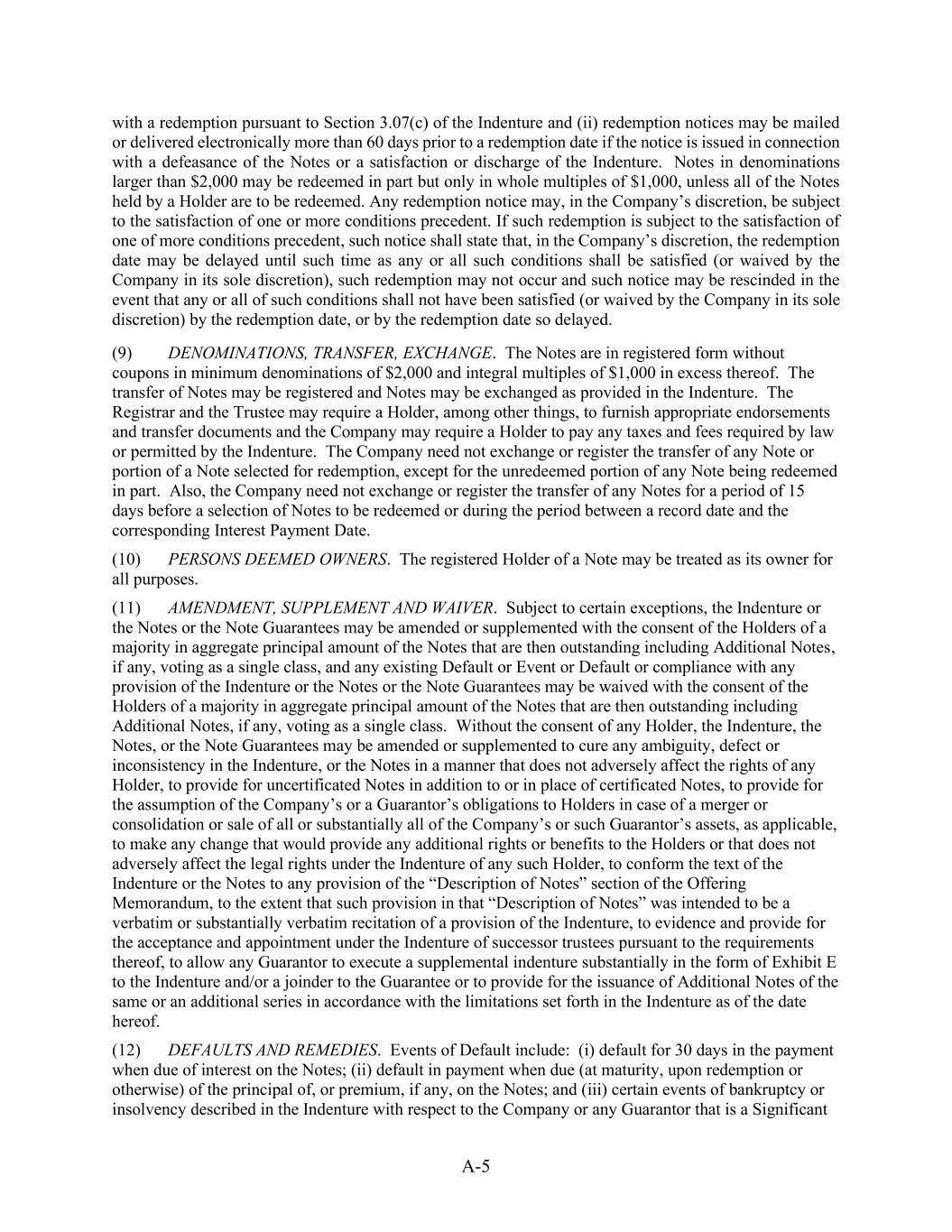 A-5 with a redemption pursuant to Section 3.07(c) of the Indenture and (ii) redemption notices may be mailed or delivered electronically more than 60 days prior to a redemption date if the notice is issued in connection with a defeasance of the Notes or a satisfaction or discharge of the Indenture. Notes in denominations larger than $2,000 may be redeemed in part but only in whole multiples of $1,000, unless all of the Notes held by a Holder are to be redeemed. Any redemption notice may, in the Company’s discretion, be subject to the satisfaction of one or more conditions precedent. If such redemption is subject to the satisfaction of one of more conditions precedent, such notice shall state that, in the Company’s discretion, the redemption date may be delayed until such time as any or all such conditions shall be satisfied (or waived by the Company in its sole discretion), such redemption may not occur and such notice may be rescinded in the event that any or all of such conditions shall not have been satisfied (or waived by the Company in its sole discretion) by the redemption date, or by the redemption date so delayed. (9) DENOMINATIONS, TRANSFER, EXCHANGE. The Notes are in registered form without coupons in minimum denominations of $2,000 and integral multiples of $1,000 in excess thereof. The transfer of Notes may be registered and Notes may be exchanged as provided in the Indenture. The Registrar and the Trustee may require a Holder, among other things, to furnish appropriate endorsements and transfer documents and the Company may require a Holder to pay any taxes and fees required by law or permitted by the Indenture. The Company need not exchange or register the transfer of any Note or portion of a Note selected for redemption, except for the unredeemed portion of any Note being redeemed in part. Also, the Company need not exchange or register the transfer of any Notes for a period of 15 days before a selection of Notes to be redeemed or during the period between a record date and the corresponding Interest Payment Date. (10) PERSONS DEEMED OWNERS. The registered Holder of a Note may be treated as its owner for all purposes. (11) AMENDMENT, SUPPLEMENT AND WAIVER. Subject to certain exceptions, the Indenture or the Notes or the Note Guarantees may be amended or supplemented with the consent of the Holders of a majority in aggregate principal amount of the Notes that are then outstanding including Additional Notes, if any, voting as a single class, and any existing Default or Event or Default or compliance with any provision of the Indenture or the Notes or the Note Guarantees may be waived with the consent of the Holders of a majority in aggregate principal amount of the Notes that are then outstanding including Additional Notes, if any, voting as a single class. Without the consent of any Holder, the Indenture, the Notes, or the Note Guarantees may be amended or supplemented to cure any ambiguity, defect or inconsistency in the Indenture, or the Notes in a manner that does not adversely affect the rights of any Holder, to provide for uncertificated Notes in addition to or in place of certificated Notes, to provide for the assumption of the Company’s or a Guarantor’s obligations to Holders in case of a merger or consolidation or sale of all or substantially all of the Company’s or such Guarantor’s assets, as applicable, to make any change that would provide any additional rights or benefits to the Holders or that does not adversely affect the legal rights under the Indenture of any such Holder, to conform the text of the Indenture or the Notes to any provision of the “Description of Notes” section of the Offering Memorandum, to the extent that such provision in that “Description of Notes” was intended to be a verbatim or substantially verbatim recitation of a provision of the Indenture, to evidence and provide for the acceptance and appointment under the Indenture of successor trustees pursuant to the requirements thereof, to allow any Guarantor to execute a supplemental indenture substantially in the form of Exhibit E to the Indenture and/or a joinder to the Guarantee or to provide for the issuance of Additional Notes of the same or an additional series in accordance with the limitations set forth in the Indenture as of the date hereof. (12) DEFAULTS AND REMEDIES. Events of Default include: (i) default for 30 days in the payment when due of interest on the Notes; (ii) default in payment when due (at maturity, upon redemption or otherwise) of the principal of, or premium, if any, on the Notes; and (iii) certain events of bankruptcy or insolvency described in the Indenture with respect to the Company or any Guarantor that is a Significant