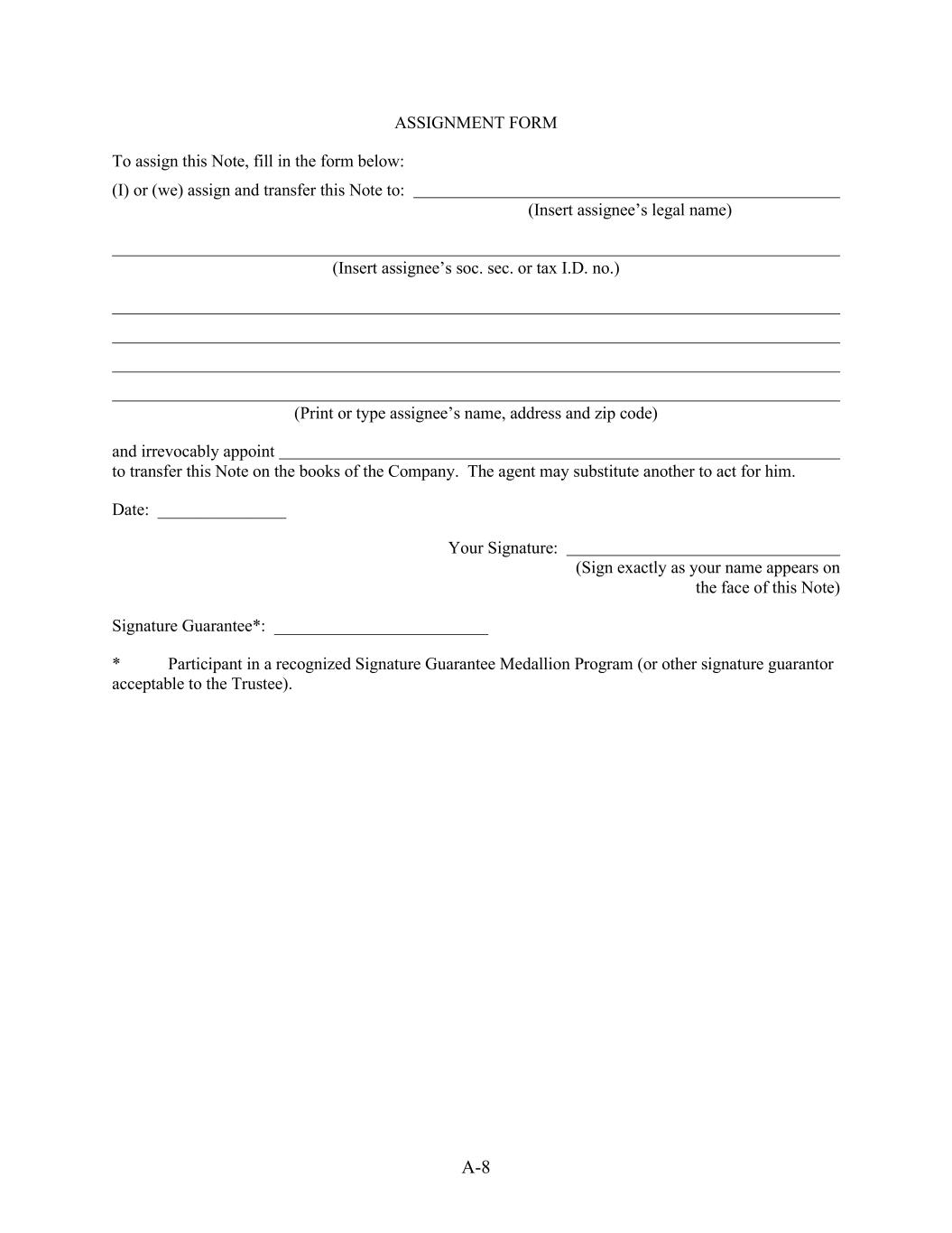 A-8 ASSIGNMENT FORM To assign this Note, fill in the form below: (I) or (we) assign and transfer this Note to: (Insert assignee’s legal name) (Insert assignee’s soc. sec. or tax I.D. no.) (Print or type assignee’s name, address and zip code) and irrevocably appoint to transfer this Note on the books of the Company. The agent may substitute another to act for him. Date: _______________ Your Signature: (Sign exactly as your name appears on the face of this Note) Signature Guarantee*: _________________________ * Participant in a recognized Signature Guarantee Medallion Program (or other signature guarantor acceptable to the Trustee).