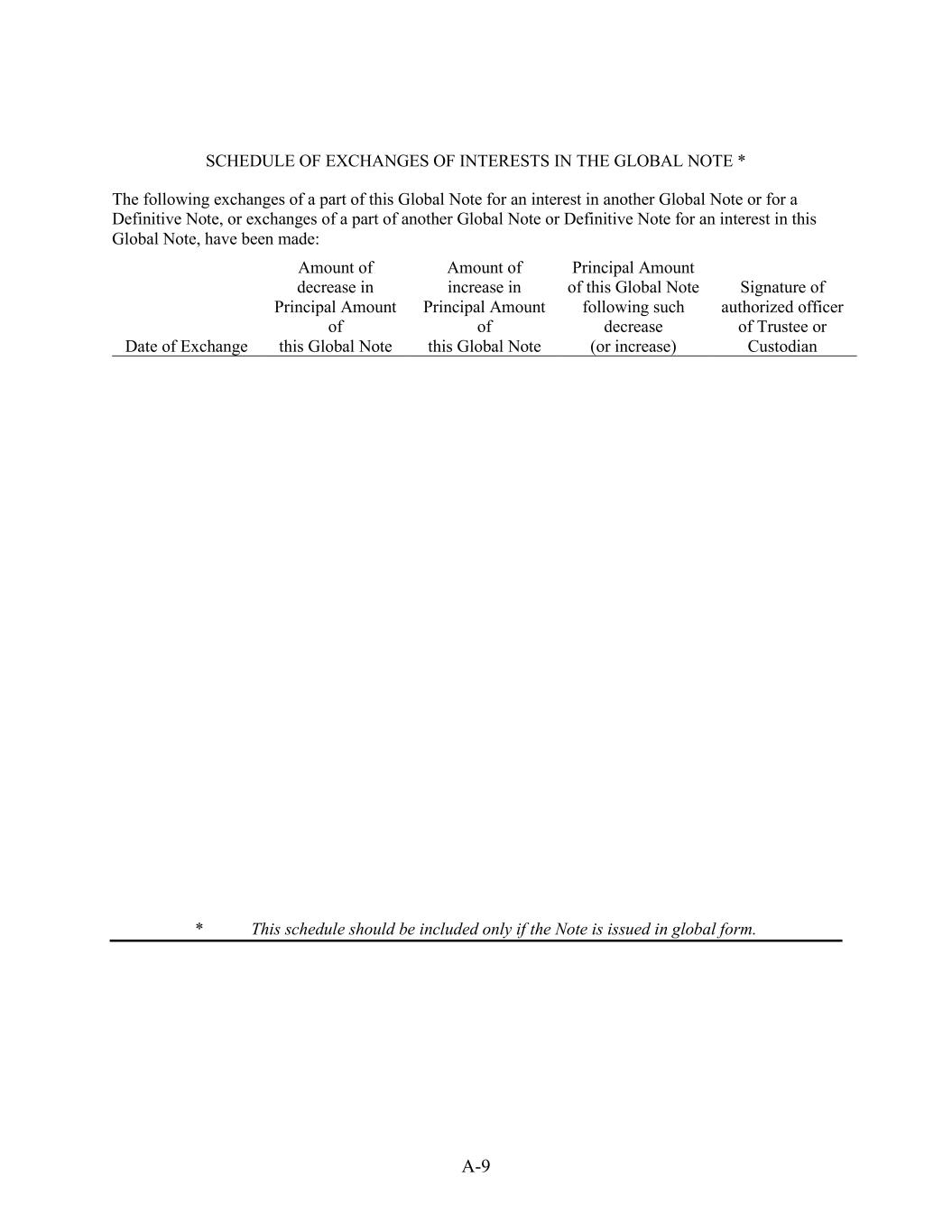 A-9 SCHEDULE OF EXCHANGES OF INTERESTS IN THE GLOBAL NOTE * The following exchanges of a part of this Global Note for an interest in another Global Note or for a Definitive Note, or exchanges of a part of another Global Note or Definitive Note for an interest in this Global Note, have been made: Date of Exchange Amount of decrease in Principal Amount of this Global Note Amount of increase in Principal Amount of this Global Note Principal Amount of this Global Note following such decrease (or increase) Signature of authorized officer of Trustee or Custodian * This schedule should be included only if the Note is issued in global form.