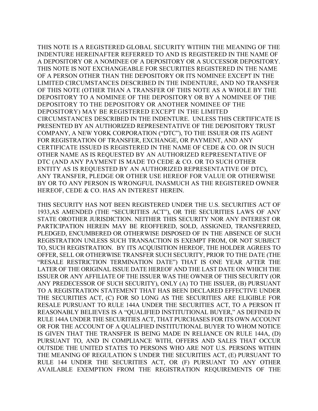 THIS NOTE IS A REGISTERED GLOBAL SECURITY WITHIN THE MEANING OF THE INDENTURE HEREINAFTER REFERRED TO AND IS REGISTERED IN THE NAME OF A DEPOSITORY OR A NOMINEE OF A DEPOSITORY OR A SUCCESSOR DEPOSITORY. THIS NOTE IS NOT EXCHANGEABLE FOR SECURITIES REGISTERED IN THE NAME OF A PERSON OTHER THAN THE DEPOSITORY OR ITS NOMINEE EXCEPT IN THE LIMITED CIRCUMSTANCES DESCRIBED IN THE INDENTURE, AND NO TRANSFER OF THIS NOTE (OTHER THAN A TRANSFER OF THIS NOTE AS A WHOLE BY THE DEPOSITORY TO A NOMINEE OF THE DEPOSITORY OR BY A NOMINEE OF THE DEPOSITORY TO THE DEPOSITORY OR ANOTHER NOMINEE OF THE DEPOSITORY) MAY BE REGISTERED EXCEPT IN THE LIMITED CIRCUMSTANCES DESCRIBED IN THE INDENTURE. UNLESS THIS CERTIFICATE IS PRESENTED BY AN AUTHORIZED REPRESENTATIVE OF THE DEPOSITORY TRUST COMPANY, A NEW YORK CORPORATION (“DTC”), TO THE ISSUER OR ITS AGENT FOR REGISTRATION OF TRANSFER, EXCHANGE, OR PAYMENT, AND ANY CERTIFICATE ISSUED IS REGISTERED IN THE NAME OF CEDE & CO. OR IN SUCH OTHER NAME AS IS REQUESTED BY AN AUTHORIZED REPRESENTATIVE OF DTC (AND ANY PAYMENT IS MADE TO CEDE & CO. OR TO SUCH OTHER ENTITY AS IS REQUESTED BY AN AUTHORIZED REPRESENTATIVE OF DTC), ANY TRANSFER, PLEDGE OR OTHER USE HEREOF FOR VALUE OR OTHERWISE BY OR TO ANY PERSON IS WRONGFUL INASMUCH AS THE REGISTERED OWNER HEREOF, CEDE & CO. HAS AN INTEREST HEREIN. THIS SECURITY HAS NOT BEEN REGISTERED UNDER THE U.S. SECURITIES ACT OF 1933,AS AMENDED (THE “SECURITIES ACT”), OR THE SECURITIES LAWS OF ANY STATE OROTHER JURISDICTION. NEITHER THIS SECURITY NOR ANY INTEREST OR PARTICIPATION HEREIN MAY BE REOFFERED, SOLD, ASSIGNED, TRANSFERRED, PLEDGED, ENCUMBERED OR OTHERWISE DISPOSED OF IN THE ABSENCE OF SUCH REGISTRATION UNLESS SUCH TRANSACTION IS EXEMPT FROM, OR NOT SUBJECT TO, SUCH REGISTRATION. BY ITS ACQUISITION HEREOF, THE HOLDER AGREES TO OFFER, SELL OR OTHERWISE TRANSFER SUCH SECURITY, PRIOR TO THE DATE (THE “RESALE RESTRICTION TERMINATION DATE”) THAT IS ONE YEAR AFTER THE LATER OF THE ORIGINAL ISSUE DATE HEREOF AND THE LAST DATE ON WHICH THE ISSUER OR ANY AFFILIATE OF THE ISSUER WAS THE OWNER OF THIS SECURITY (OR ANY PREDECESSOR OF SUCH SECURITY), ONLY (A) TO THE ISSUER, (B) PURSUANT TO A REGISTRATION STATEMENT THAT HAS BEEN DECLARED EFFECTIVE UNDER THE SECURITIES ACT, (C) FOR SO LONG AS THE SECURITIES ARE ELIGIBLE FOR RESALE PURSUANT TO RULE 144A UNDER THE SECURITIES ACT, TO A PERSON IT REASONABLY BELIEVES IS A “QUALIFIED INSTITUTIONAL BUYER,” AS DEFINED IN RULE 144A UNDER THE SECURITIES ACT, THAT PURCHASES FOR ITS OWN ACCOUNT OR FOR THE ACCOUNT OF A QUALIFIED INSTITUTIONAL BUYER TO WHOM NOTICE IS GIVEN THAT THE TRANSFER IS BEING MADE IN RELIANCE ON RULE 144A, (D) PURSUANT TO, AND IN COMPLIANCE WITH, OFFERS AND SALES THAT OCCUR OUTSIDE THE UNITED STATES TO PERSONS WHO ARE NOT U.S. PERSONS WITHIN THE MEANING OF REGULATION S UNDER THE SECURITIES ACT, (E) PURSUANT TO RULE 144 UNDER THE SECURITIES ACT, OR (F) PURSUANT TO ANY OTHER AVAILABLE EXEMPTION FROM THE REGISTRATION REQUIREMENTS OF THE