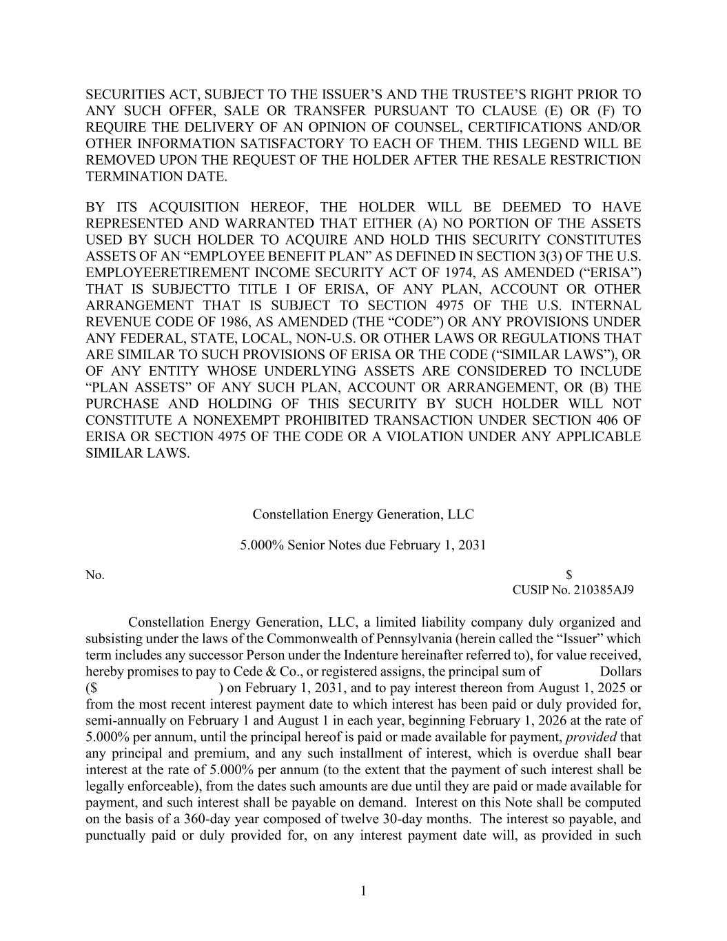 1 SECURITIES ACT, SUBJECT TO THE ISSUER’S AND THE TRUSTEE’S RIGHT PRIOR TO ANY SUCH OFFER, SALE OR TRANSFER PURSUANT TO CLAUSE (E) OR (F) TO REQUIRE THE DELIVERY OF AN OPINION OF COUNSEL, CERTIFICATIONS AND/OR OTHER INFORMATION SATISFACTORY TO EACH OF THEM. THIS LEGEND WILL BE REMOVED UPON THE REQUEST OF THE HOLDER AFTER THE RESALE RESTRICTION TERMINATION DATE. BY ITS ACQUISITION HEREOF, THE HOLDER WILL BE DEEMED TO HAVE REPRESENTED AND WARRANTED THAT EITHER (A) NO PORTION OF THE ASSETS USED BY SUCH HOLDER TO ACQUIRE AND HOLD THIS SECURITY CONSTITUTES ASSETS OF AN “EMPLOYEE BENEFIT PLAN” AS DEFINED IN SECTION 3(3) OF THE U.S. EMPLOYEERETIREMENT INCOME SECURITY ACT OF 1974, AS AMENDED (“ERISA”) THAT IS SUBJECTTO TITLE I OF ERISA, OF ANY PLAN, ACCOUNT OR OTHER ARRANGEMENT THAT IS SUBJECT TO SECTION 4975 OF THE U.S. INTERNAL REVENUE CODE OF 1986, AS AMENDED (THE “CODE”) OR ANY PROVISIONS UNDER ANY FEDERAL, STATE, LOCAL, NON-U.S. OR OTHER LAWS OR REGULATIONS THAT ARE SIMILAR TO SUCH PROVISIONS OF ERISA OR THE CODE (“SIMILAR LAWS”), OR OF ANY ENTITY WHOSE UNDERLYING ASSETS ARE CONSIDERED TO INCLUDE “PLAN ASSETS” OF ANY SUCH PLAN, ACCOUNT OR ARRANGEMENT, OR (B) THE PURCHASE AND HOLDING OF THIS SECURITY BY SUCH HOLDER WILL NOT CONSTITUTE A NONEXEMPT PROHIBITED TRANSACTION UNDER SECTION 406 OF ERISA OR SECTION 4975 OF THE CODE OR A VIOLATION UNDER ANY APPLICABLE SIMILAR LAWS. Constellation Energy Generation, LLC 5.000% Senior Notes due February 1, 2031 No. $ CUSIP No. 210385AJ9 Constellation Energy Generation, LLC, a limited liability company duly organized and subsisting under the laws of the Commonwealth of Pennsylvania (herein called the “Issuer” which term includes any successor Person under the Indenture hereinafter referred to), for value received, hereby promises to pay to Cede & Co., or registered assigns, the principal sum of Dollars ($ ) on February 1, 2031, and to pay interest thereon from August 1, 2025 or from the most recent interest payment date to which interest has been paid or duly provided for, semi-annually on February 1 and August 1 in each year, beginning February 1, 2026 at the rate of 5.000% per annum, until the principal hereof is paid or made available for payment, provided that any principal and premium, and any such installment of interest, which is overdue shall bear interest at the rate of 5.000% per annum (to the extent that the payment of such interest shall be legally enforceable), from the dates such amounts are due until they are paid or made available for payment, and such interest shall be payable on demand. Interest on this Note shall be computed on the basis of a 360-day year composed of twelve 30-day months. The interest so payable, and punctually paid or duly provided for, on any interest payment date will, as provided in such