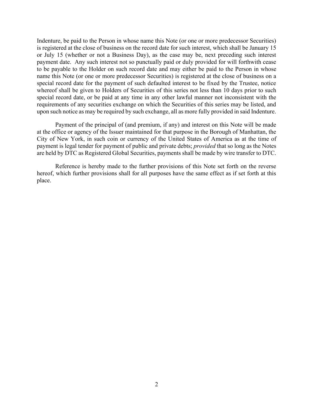 2 Indenture, be paid to the Person in whose name this Note (or one or more predecessor Securities) is registered at the close of business on the record date for such interest, which shall be January 15 or July 15 (whether or not a Business Day), as the case may be, next preceding such interest payment date. Any such interest not so punctually paid or duly provided for will forthwith cease to be payable to the Holder on such record date and may either be paid to the Person in whose name this Note (or one or more predecessor Securities) is registered at the close of business on a special record date for the payment of such defaulted interest to be fixed by the Trustee, notice whereof shall be given to Holders of Securities of this series not less than 10 days prior to such special record date, or be paid at any time in any other lawful manner not inconsistent with the requirements of any securities exchange on which the Securities of this series may be listed, and upon such notice as may be required by such exchange, all as more fully provided in said Indenture. Payment of the principal of (and premium, if any) and interest on this Note will be made at the office or agency of the Issuer maintained for that purpose in the Borough of Manhattan, the City of New York, in such coin or currency of the United States of America as at the time of payment is legal tender for payment of public and private debts; provided that so long as the Notes are held by DTC as Registered Global Securities, payments shall be made by wire transfer to DTC. Reference is hereby made to the further provisions of this Note set forth on the reverse hereof, which further provisions shall for all purposes have the same effect as if set forth at this place.