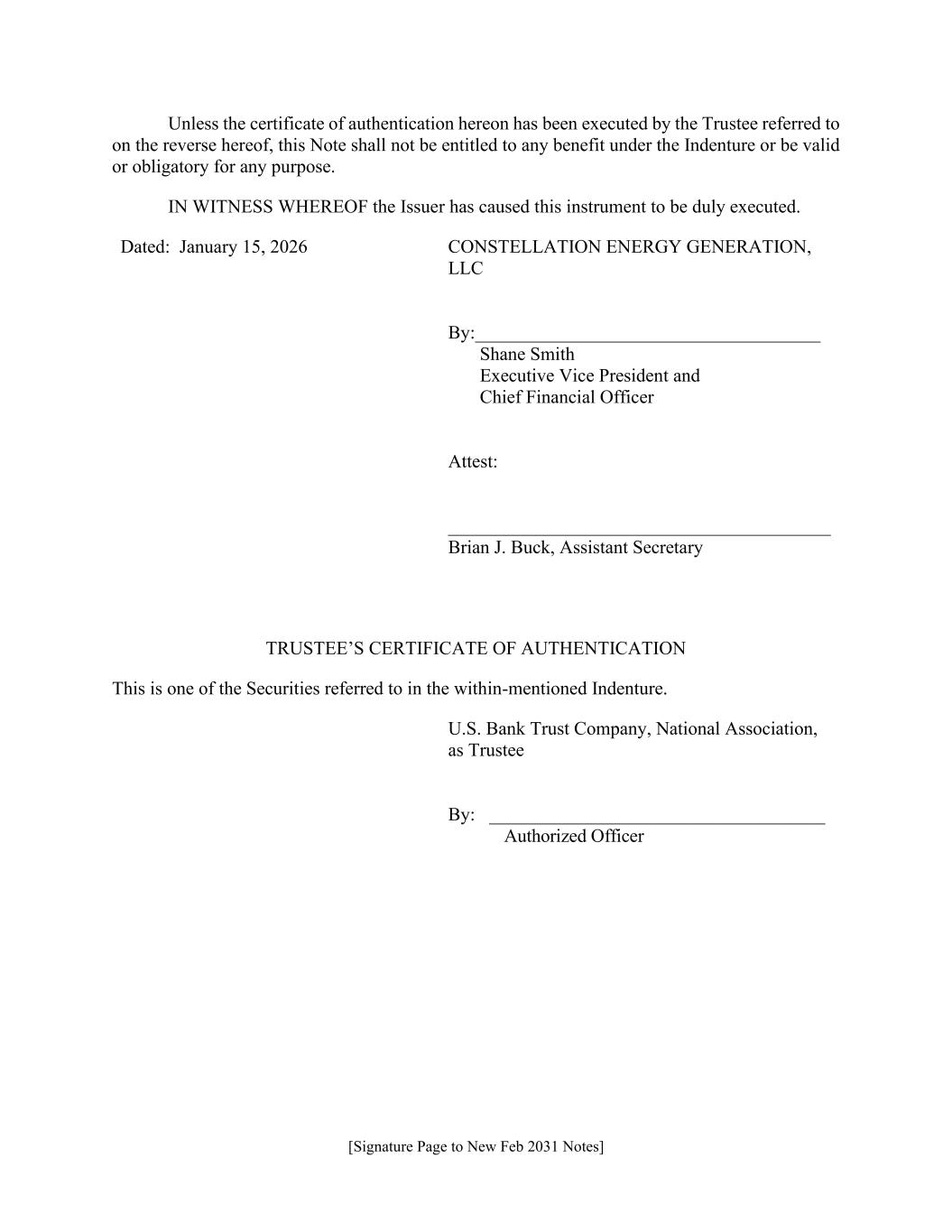 [Signature Page to New Feb 2031 Notes] Unless the certificate of authentication hereon has been executed by the Trustee referred to on the reverse hereof, this Note shall not be entitled to any benefit under the Indenture or be valid or obligatory for any purpose. IN WITNESS WHEREOF the Issuer has caused this instrument to be duly executed. Dated: January 15, 2026 CONSTELLATION ENERGY GENERATION, LLC By:_____________________________________ Shane Smith Executive Vice President and Chief Financial Officer Attest: _________________________________________ Brian J. Buck, Assistant Secretary TRUSTEE’S CERTIFICATE OF AUTHENTICATION This is one of the Securities referred to in the within-mentioned Indenture. U.S. Bank Trust Company, National Association, as Trustee By: ____________________________________ Authorized Officer