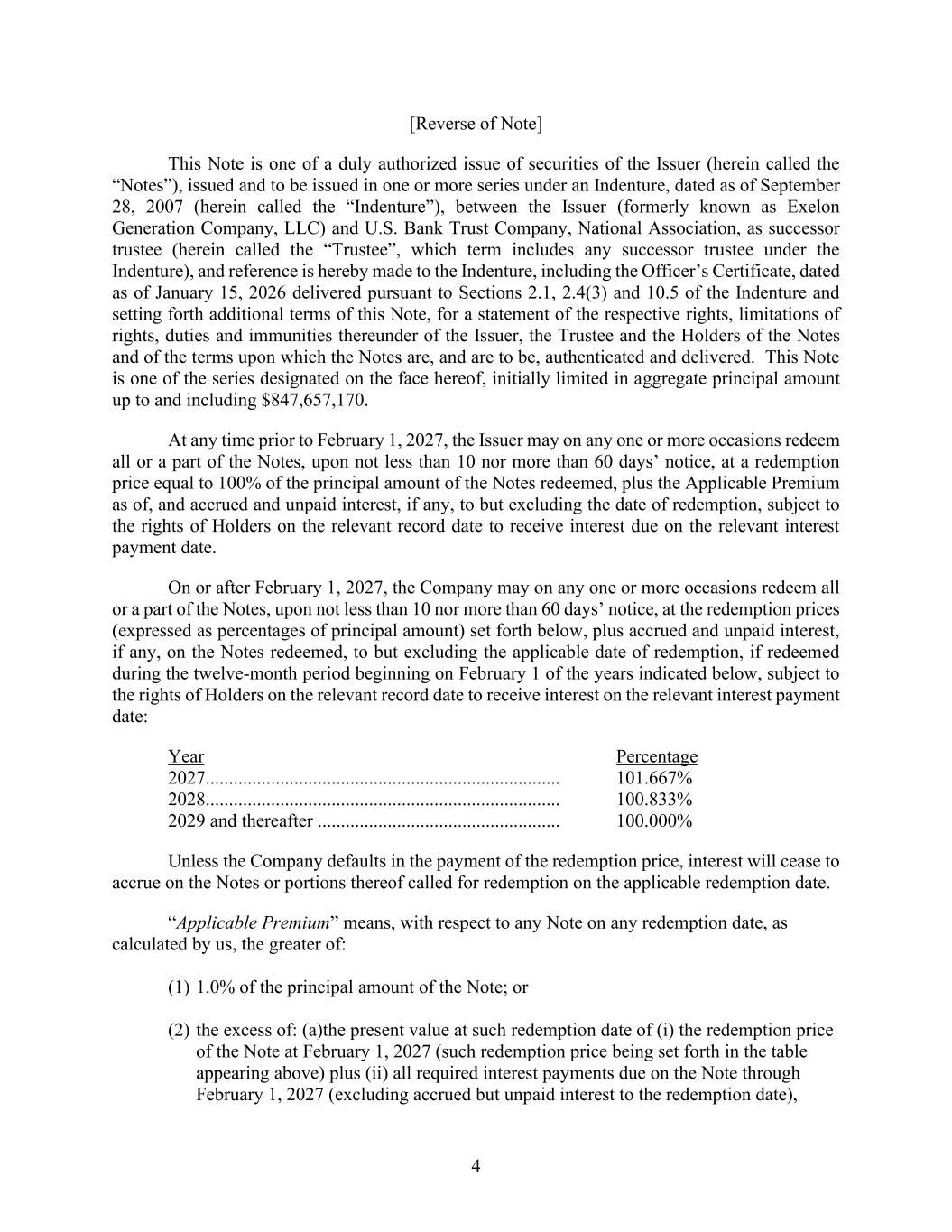 4 [Reverse of Note] This Note is one of a duly authorized issue of securities of the Issuer (herein called the “Notes”), issued and to be issued in one or more series under an Indenture, dated as of September 28, 2007 (herein called the “Indenture”), between the Issuer (formerly known as Exelon Generation Company, LLC) and U.S. Bank Trust Company, National Association, as successor trustee (herein called the “Trustee”, which term includes any successor trustee under the Indenture), and reference is hereby made to the Indenture, including the Officer’s Certificate, dated as of January 15, 2026 delivered pursuant to Sections 2.1, 2.4(3) and 10.5 of the Indenture and setting forth additional terms of this Note, for a statement of the respective rights, limitations of rights, duties and immunities thereunder of the Issuer, the Trustee and the Holders of the Notes and of the terms upon which the Notes are, and are to be, authenticated and delivered. This Note is one of the series designated on the face hereof, initially limited in aggregate principal amount up to and including $847,657,170. At any time prior to February 1, 2027, the Issuer may on any one or more occasions redeem all or a part of the Notes, upon not less than 10 nor more than 60 days’ notice, at a redemption price equal to 100% of the principal amount of the Notes redeemed, plus the Applicable Premium as of, and accrued and unpaid interest, if any, to but excluding the date of redemption, subject to the rights of Holders on the relevant record date to receive interest due on the relevant interest payment date. On or after February 1, 2027, the Company may on any one or more occasions redeem all or a part of the Notes, upon not less than 10 nor more than 60 days’ notice, at the redemption prices (expressed as percentages of principal amount) set forth below, plus accrued and unpaid interest, if any, on the Notes redeemed, to but excluding the applicable date of redemption, if redeemed during the twelve-month period beginning on February 1 of the years indicated below, subject to the rights of Holders on the relevant record date to receive interest on the relevant interest payment date: Year Percentage 2027............................................................................ 101.667% 2028............................................................................ 100.833% 2029 and thereafter .................................................... 100.000% Unless the Company defaults in the payment of the redemption price, interest will cease to accrue on the Notes or portions thereof called for redemption on the applicable redemption date. “Applicable Premium” means, with respect to any Note on any redemption date, as calculated by us, the greater of: (1) 1.0% of the principal amount of the Note; or (2) the excess of: (a)the present value at such redemption date of (i) the redemption price of the Note at February 1, 2027 (such redemption price being set forth in the table appearing above) plus (ii) all required interest payments due on the Note through February 1, 2027 (excluding accrued but unpaid interest to the redemption date),