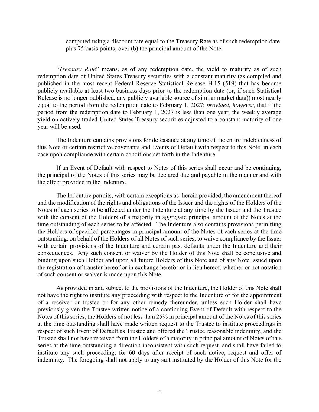 5 computed using a discount rate equal to the Treasury Rate as of such redemption date plus 75 basis points; over (b) the principal amount of the Note. “Treasury Rate” means, as of any redemption date, the yield to maturity as of such redemption date of United States Treasury securities with a constant maturity (as compiled and published in the most recent Federal Reserve Statistical Release H.15 (519) that has become publicly available at least two business days prior to the redemption date (or, if such Statistical Release is no longer published, any publicly available source of similar market data)) most nearly equal to the period from the redemption date to February 1, 2027; provided, however, that if the period from the redemption date to February 1, 2027 is less than one year, the weekly average yield on actively traded United States Treasury securities adjusted to a constant maturity of one year will be used. The Indenture contains provisions for defeasance at any time of the entire indebtedness of this Note or certain restrictive covenants and Events of Default with respect to this Note, in each case upon compliance with certain conditions set forth in the Indenture. If an Event of Default with respect to Notes of this series shall occur and be continuing, the principal of the Notes of this series may be declared due and payable in the manner and with the effect provided in the Indenture. The Indenture permits, with certain exceptions as therein provided, the amendment thereof and the modification of the rights and obligations of the Issuer and the rights of the Holders of the Notes of each series to be affected under the Indenture at any time by the Issuer and the Trustee with the consent of the Holders of a majority in aggregate principal amount of the Notes at the time outstanding of each series to be affected. The Indenture also contains provisions permitting the Holders of specified percentages in principal amount of the Notes of each series at the time outstanding, on behalf of the Holders of all Notes of such series, to waive compliance by the Issuer with certain provisions of the Indenture and certain past defaults under the Indenture and their consequences. Any such consent or waiver by the Holder of this Note shall be conclusive and binding upon such Holder and upon all future Holders of this Note and of any Note issued upon the registration of transfer hereof or in exchange herefor or in lieu hereof, whether or not notation of such consent or waiver is made upon this Note. As provided in and subject to the provisions of the Indenture, the Holder of this Note shall not have the right to institute any proceeding with respect to the Indenture or for the appointment of a receiver or trustee or for any other remedy thereunder, unless such Holder shall have previously given the Trustee written notice of a continuing Event of Default with respect to the Notes of this series, the Holders of not less than 25% in principal amount of the Notes of this series at the time outstanding shall have made written request to the Trustee to institute proceedings in respect of such Event of Default as Trustee and offered the Trustee reasonable indemnity, and the Trustee shall not have received from the Holders of a majority in principal amount of Notes of this series at the time outstanding a direction inconsistent with such request, and shall have failed to institute any such proceeding, for 60 days after receipt of such notice, request and offer of indemnity. The foregoing shall not apply to any suit instituted by the Holder of this Note for the