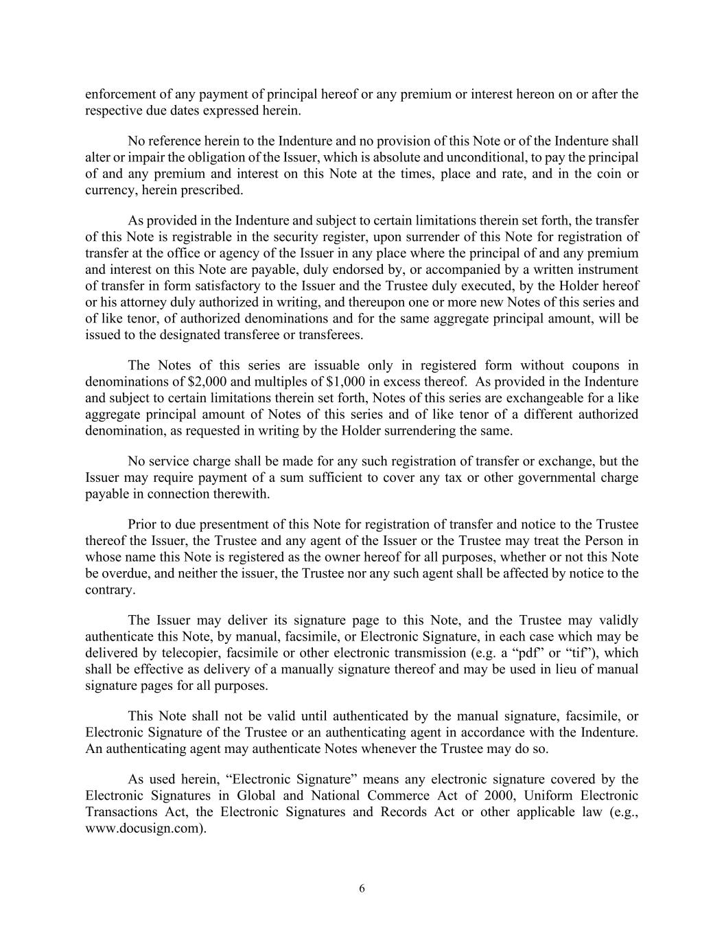 6 enforcement of any payment of principal hereof or any premium or interest hereon on or after the respective due dates expressed herein. No reference herein to the Indenture and no provision of this Note or of the Indenture shall alter or impair the obligation of the Issuer, which is absolute and unconditional, to pay the principal of and any premium and interest on this Note at the times, place and rate, and in the coin or currency, herein prescribed. As provided in the Indenture and subject to certain limitations therein set forth, the transfer of this Note is registrable in the security register, upon surrender of this Note for registration of transfer at the office or agency of the Issuer in any place where the principal of and any premium and interest on this Note are payable, duly endorsed by, or accompanied by a written instrument of transfer in form satisfactory to the Issuer and the Trustee duly executed, by the Holder hereof or his attorney duly authorized in writing, and thereupon one or more new Notes of this series and of like tenor, of authorized denominations and for the same aggregate principal amount, will be issued to the designated transferee or transferees. The Notes of this series are issuable only in registered form without coupons in denominations of $2,000 and multiples of $1,000 in excess thereof. As provided in the Indenture and subject to certain limitations therein set forth, Notes of this series are exchangeable for a like aggregate principal amount of Notes of this series and of like tenor of a different authorized denomination, as requested in writing by the Holder surrendering the same. No service charge shall be made for any such registration of transfer or exchange, but the Issuer may require payment of a sum sufficient to cover any tax or other governmental charge payable in connection therewith. Prior to due presentment of this Note for registration of transfer and notice to the Trustee thereof the Issuer, the Trustee and any agent of the Issuer or the Trustee may treat the Person in whose name this Note is registered as the owner hereof for all purposes, whether or not this Note be overdue, and neither the issuer, the Trustee nor any such agent shall be affected by notice to the contrary. The Issuer may deliver its signature page to this Note, and the Trustee may validly authenticate this Note, by manual, facsimile, or Electronic Signature, in each case which may be delivered by telecopier, facsimile or other electronic transmission (e.g. a “pdf” or “tif”), which shall be effective as delivery of a manually signature thereof and may be used in lieu of manual signature pages for all purposes. This Note shall not be valid until authenticated by the manual signature, facsimile, or Electronic Signature of the Trustee or an authenticating agent in accordance with the Indenture. An authenticating agent may authenticate Notes whenever the Trustee may do so. As used herein, “Electronic Signature” means any electronic signature covered by the Electronic Signatures in Global and National Commerce Act of 2000, Uniform Electronic Transactions Act, the Electronic Signatures and Records Act or other applicable law (e.g., www.docusign.com).