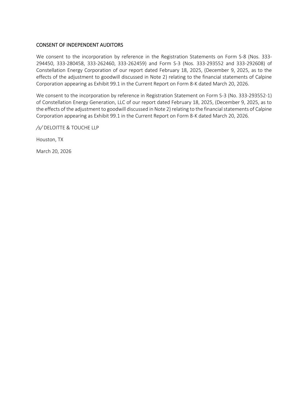 CONSENT OF INDEPENDENT AUDITORS We consent to the incorporation by reference in the Registration Statements on Form S-8 (Nos. 333- 294450, 333-280458, 333-262460, 333-262459) and Form S-3 (Nos. 333-293552 and 333-292608) of Constellation Energy Corporation of our report dated February 18, 2025, (December 9, 2025, as to the effects of the adjustment to goodwill discussed in Note 2) relating to the financial statements of Calpine Corporation appearing as Exhibit 99.1 in the Current Report on Form 8-K dated March 20, 2026. We consent to the incorporation by reference in Registration Statement on Form S-3 (No. 333-293552-1) of Constellation Energy Generation, LLC of our report dated February 18, 2025, (December 9, 2025, as to the effects of the adjustment to goodwill discussed in Note 2) relating to the financial statements of Calpine Corporation appearing as Exhibit 99.1 in the Current Report on Form 8-K dated March 20, 2026. /s/ DELOITTE & TOUCHE LLP Houston, TX March 20, 2026