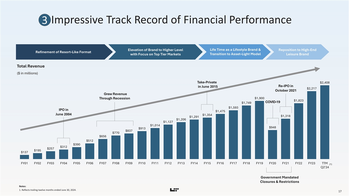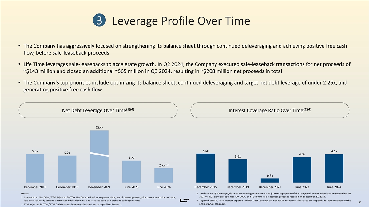 L E G A L FORWARD-LOOKING STATEMENTS This presentation includes “forward-looking statements” within the meaning of federal securities regulations. Forward-looking statements in this presentation include, but are not limited to, the plans, strategies and prospects, both business and financial, of Life Time Group Holdings, Inc. (the “Company”), including its financial outlook and cash flow, possible or assumed future actions, opportunities for growth and margin expansion, improvements to its balance sheet and leverage, capital expenditures, consumer demand, industry and economic trends, business strategies, events or results of operations. These statements are based on the beliefs and assumptions of the Company’s management. Forward-looking statements are inherently subject to risks, uncertainties and assumptions. Generally, statements that are not historical facts, including statements concerning the Company’s possible or assumed future actions, business strategies, events or results of operations, are forward-looking statements. These statements may be preceded by, followed by or otherwise include the words “believes,” “assumes,” “expects,” “anticipates,” “intends,” “continues,” “projects,” “predicts,” “estimates,” “plans,” “potential,” “may increase,” “may result,” “will result,” “may fluctuate,” and similar expressions or future or conditional verbs such as “will,” “should,” “would,” “foreseeable,” “may,” and “could” as well as the negative version of these words or similar terms and phrases. In addition, any statements or information that refer to expectations, beliefs, plans, projections, objectives, performance or other characterizations of future events or circumstances, including any underlying assumptions, are forward-looking. Factors that could cause actual results to differ materially from those forward-looking statements included in this presentation include, but are not limited to, risks relating to the Company’s business operations and competitive and economic environment, risks relating to its brand, risks relating to the growth of its business, risks relating to its technological operations, risks relating to its capital structure and lease obligations, risks relating to its human capital, risks relating to legal compliance and risk management, and risks relating to ownership of the Company’s common stock and the other important factors discussed under the caption “Risk Factors” in the Company’s Annual Report on Form 10-K for the year ended December 31, 2023, filed with the Securities and Exchange Commission (the “SEC”) on February 28, 2024 (File No. 001-40887), as such factors may be updated from time to time in the Company’s other filings with the SEC, which are accessible on the SEC’s website at www.sec.gov. These and other important factors could cause actual results to differ materially from those indicated by the forward-looking statements made in this presentation. Any forward-looking statement that the Company makes in this presentation speaks only as of the date of such statement. Except as required by law, the Company does not have any obligation to update or revise, or to publicly announce any update or revision to, any of the forward-looking statements, whether as a result of new information, future events or otherwise. This presentation includes certain preliminary results for the three months ended September 30, 2024. These results are based on the information currently available to the Company as of the date of this presentation. The Company's actual financial results for the fiscal three months ended September 30, 2024 are not yet available, and its closing procedures for this period are not yet completed. The Company's actual results may vary from the estimated preliminary results and other data presented in this presentation. The preliminary financial results included in this presentation have been prepared by, and are the responsibility of, the Company's management. Deloitte & Touche LLP has not audited, reviewed, compiled, or applied agreed-upon procedures with respect to the preliminary financial results. Accordingly, Deloitte & Touche LLP does not express an opinion or any other form of assurance with respect thereto. NON-GAAP FINANCIAL INFORMATION This presentation includes Adjusted EBITDA, Net Debt and Free Cash Flow and calculations in connection therewith, which are not presented in accordance with the generally accepted accounting principles in the United States (“GAAP”). These non-GAAP financial measures are not based on any comprehensive set of accounting rules or principles and should not be considered as alternatives to net income (loss), total debt or any other performance measures derived in accordance with GAAP or as an alternative to net cash provided by operating activities as a measure of liquidity and may not be comparable to other similarly titled measures of other businesses. These non-GAAP financial measures have limitations as an analytical tool, and should not be construed as an inference that the Company’s future results will be unaffected by unusual or non-recurring items. In addition, these non-GAAP financial measures should be read in conjunction with the Company’s financial statements prepared in accordance with GAAP. A reconciliation of each non-GAAP measure to the corresponding GAAP measure is contained in the Appendix to this presentation. This presentation also presents non-GAAP financial information as of and for the trailing twelve months (“TTM”) ended June 30, 2024, which has been calculated by adding the unaudited statement of operations data for the six months ended June 30, 2024 to the audited statement of operations data for the year ended December 31, 2023 and then subtracting the unaudited statement of operations data for the six months ended June 30, 2023. This presentation shall not cons