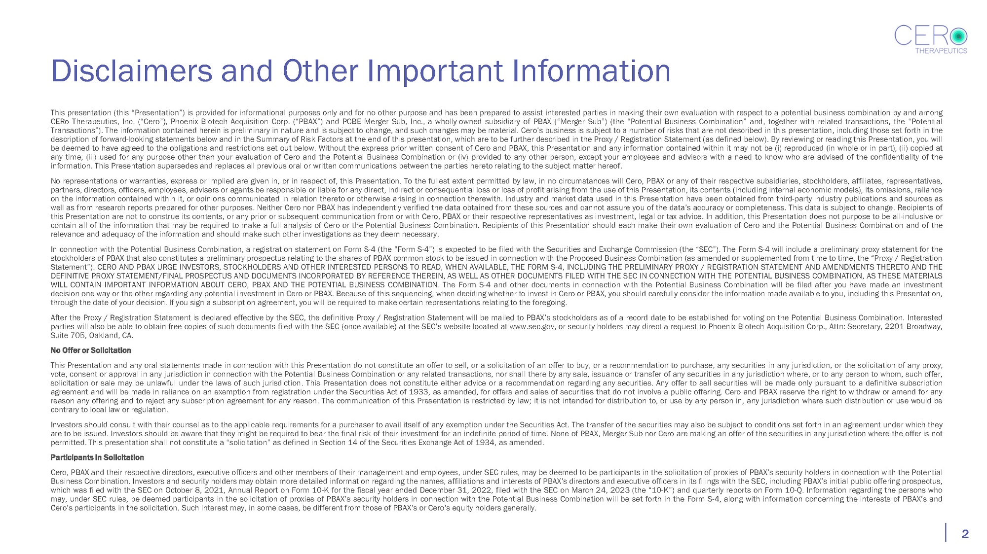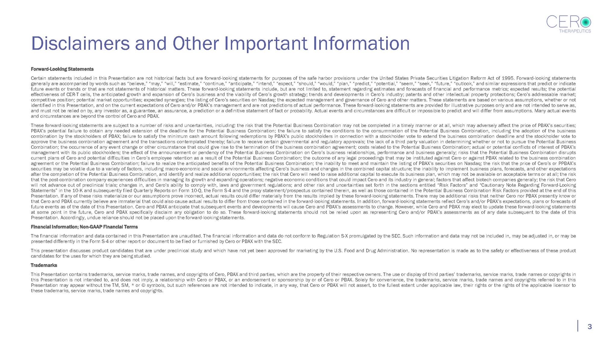 Disclaimers and Other Important Information 2 This presentation (this “Presentation”) is provided for informational purposes only and for no other purpose and has been prepared to assist interested parties in making their own evaluation with respect to a potential business combination by and among CERo Therapeutics, Inc . (“Cero”), Phoenix Biotech Acquisition Corp . (“PBAX”) and PCBE Merger Sub, Inc . , a wholly - owned subsidiary of PBAX (“Merger Sub”) (the “Potential Business Combination” and, together with related transactions, the “Potential Transactions”) . The information contained herein is preliminary in nature and is subject to change, and such changes may be material . Cero’s business is subject to a number of risks that are not described in this presentation, including those set forth in the description of forward - looking statements below and in the Summary of Risk Factors at the end of this presentation, which are to be further described in the Proxy / Registration Statement (as defined below) . By reviewing or reading this Presentation, you will be deemed to have agreed to the obligations and restrictions set out below . Without the express prior written consent of Cero and PBAX, this Presentation and any information contained within it may not be (i) reproduced (in whole or in part), (ii) copied at any time, (iii) used for any purpose other than your evaluation of Cero and the Potential Business Combination or (iv) provided to any other person, except your employees and advisors with a need to know who are advised of the confidentiality of the information . This Presentation supersedes and replaces all previous oral or written communications between the parties hereto relating to the subject matter hereof . No representations or warranties, express or implied are given in, or in respect of, this Presentation . To the fullest extent permitted by law, in no circumstances will Cero, PBAX or any of their respective subsidiaries, stockholders, affiliates, representatives, partners, directors, officers, employees, advisers or agents be responsible or liable for any direct, indirect or consequential loss or loss of profit arising from the use of this Presentation, its contents (including internal economic models), its omissions, reliance on the information contained within it, or opinions communicated in relation thereto or otherwise arising in connection therewith . Industry and market data used in this Presentation have been obtained from third - party industry publications and sources as well as from research reports prepared for other purposes . Neither Cero nor PBAX has independently verified the data obtained from these sources and cannot assure you of the data’s accuracy or completeness . This data is subject to change . Recipients of this Presentation are not to construe its contents, or any prior or subsequent communication from or with Cero, PBAX or their respective representatives as investment, legal or tax advice . In addition, this Presentation does not purpose to be all - inclusive or contain all of the information that may be required to make a full analysis of Cero or the Potential Business Combination . Recipients of this Presentation should each make their own evaluation of Cero and the Potential Business Combination and of the relevance and adequacy of the information and should make such other investigations as they deem necessary . In connection with the Potential Business Combination, a registration statement on Form S - 4 (the “Form S - 4 ”) is expected to be filed with the Securities and Exchange Commission (the “SEC”) . The Form S - 4 will include a preliminary proxy statement for the stockholders of PBAX that also constitutes a preliminary prospectus relating to the shares of PBAX common stock to be issued in connection with the Proposed Business Combination (as amended or supplemented from time to time, the “Proxy / Registration Statement”) . CERO AND PBAX URGE INVESTORS, STOCKHOLDERS AND OTHER INTERESTED PERSONS TO READ, WHEN AVAILABLE, THE FORM S - 4 , INCLUDING THE PRELIMINARY PROXY / REGISTRATION STATEMENT AND AMENDMENTS THERETO AND THE DEFINITIVE PROXY STATEMENT/FINAL PROSPECTUS AND DOCUMENTS INCORPORATED BY REFERENCE THEREIN, AS WELL AS OTHER DOCUMENTS FILED WITH THE SEC IN CONNECTION WITH THE POTENTIAL BUSINESS COMBINATION, AS THESE MATERIALS WILL CONTAIN IMPORTANT INFORMATION ABOUT CERO, PBAX AND THE POTENTIAL BUSINESS COMBINATION . The Form S - 4 and other documents in connection with the Potential Business Combination will be filed after you have made an investment decision one way or the other regarding any potential investment in Cero or PBAX . Because of this sequencing, when deciding whether to invest in Cero or PBAX, you should carefully consider the information made available to you, including this Presentation, through the date of your decision . If you sign a subscription agreement, you will be required to make certain representations relating to the foregoing . After the Proxy / Registration Statement is declared effective by the SEC, the definitive Proxy / Registration Statement will be mailed to PBAX’s stockholders as of a record date to be established for voting on the Potential Business Combination . Interested parties will also be able to obtain free copies of such documents filed with the SEC (once available) at the SEC’s website located at www . sec . gov, or security holders may direct a request to Phoenix Biotech Acquisition Corp . , Attn : Secretary, 2201 Broadway, Suite 705 , Oakland, CA . No Offer or Solicitation This Presentation and any oral statements made in connection with this Presentation do not constitute an offer to sell, or a solicitation of an offer to buy, or a recommendation to purchase, any securities in any jurisdiction, or the solicitation of any proxy, vote, consent or approval in any jurisdiction in connection with the Potential Business Combination or any rel