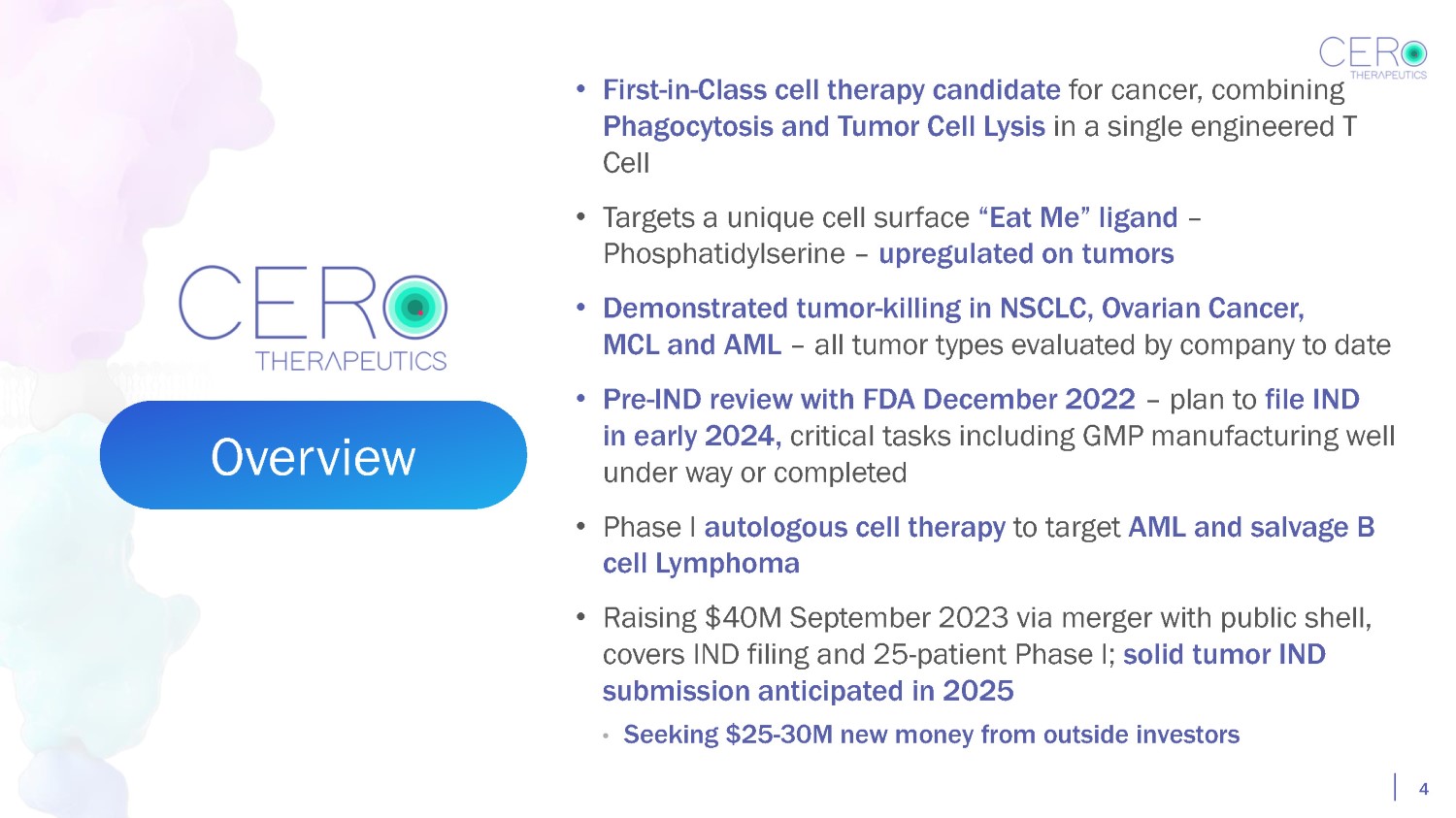 Disclaimers and Other Important Information 3 Forward - Looking Statements Certain statements included in this Presentation are not historical facts but are forward - looking statements for purposes of the safe harbor provisions under the United States Private Securities Litigation Reform Act of 1995 . Forward - looking statements generally are accompanied by words such as “believe,” “may,” “will,” “estimate,” “continue,” “anticipate,” “intend,” “expect,” “should,” “would,” “plan,” “predict,” “potential,” “seem,” “seek,” “future,” “outlook,” and similar expressions that predict or indicate future events or trends or that are not statements of historical matters . These forward - looking statements include, but are not limited to, statement regarding estimates and forecasts of financial and performance metrics ; expected results ; the potential effectiveness of CER - T cells, the anticipated growth and expansion of Cero’s business and the viability of Cero’s growth strategy ; trends and developments in Cero’s industry ; patents and other intellectual property protections ; Cero’s addressable market ; competitive position ; potential market opportunities ; expected synergies ; the listing of Cero’s securities on Nasdaq ; the expected management and governance of Cero and other matters . These statements are based on various assumptions, whether or not identified in this Presentation, and on the current expectations of Cero and/or PBAX’s management and are not predictions of actual performance . These forward - looking statements are provided for illustrative purposes only and are not intended to serve as, and must not be relied on by, any investor as, a guarantee, an assurance, a prediction or a definitive statement of fact or probability . Actual events and circumstances are difficult or impossible to predict and will differ from assumptions . Many actual events and circumstances are beyond the control of Cero and PBAX . These forward - looking statements are subject to a number of risks and uncertainties, including : the risk that the Potential Business Combination may not be completed in a timely manner or at all, which may adversely affect the price of PBAX’s securities ; PBAX’s potential failure to obtain any needed extension of the deadline for the Potential Business Combination ; the failure to satisfy the conditions to the consummation of the Potential Business Combination, including the adoption of the business combination by the stockholders of PBAX ; failure to satisfy the minimum cash amount following redemptions by PBAX’s public stockholders in connection with a stockholder vote to extend the business combination deadline and the stockholder vote to approve the business combination agreement and the transactions contemplated thereby ; failure to receive certain governmental and regulatory approvals ; the lack of a third party valuation in determining whether or not to pursue the Potential Business Combination ; the occurrence of any event change or other circumstance that could give rise to the termination of the business combination agreement ; costs related to the Potential Business Combination ; actual or potential conflicts of interest of PBAX’s management with its public stockholders ; the effect of the announcement or pendency of the Potential Business Combination on Cero’s business relationships, performance and business generally ; risks that the Potential Business Combination disrupts current plans of Cero and potential difficulties in Cero’s employee retention as a result of the Potential Business Combination ; the outcome of any legal proceedings that may be instituted against Cero or against PBAX related to the business combination agreement or the Potential Business Combination ; failure to realize the anticipated benefits of the Potential Business Combination ; the inability to meet and maintain the listing of PBAX’s securities on Nasdaq ; the risk that the price of Cero’s or PPBAX’s securities may be volatile due to a variety of factors, including macro - economic and social environments affecting Cero’s business and changes in the combined capital structure ; the inability to implement business plans, forecasts, and other expectations after the completion of the Potential Business Combination, and identify and realize additional opportunities ; the risk that Cero will need to raise additional capital to execute its business plan, which may not be available on acceptable terms or at all ; the risk that the post - combination company experiences difficulties in managing its growth and expanding operations ; negative economic conditions that could impact Cero and its industry in general ; factors that affect biotech companies generally ; the risk that Cero will not advance out of preclinical trials ; changes in, and Cero’s ability to comply with, laws and government regulations ; and other risk and uncertainties set forth in the sections entitled “Risk Factors” and “Cautionary Note Regarding Forward - Looking Statements” in the 10 - K and subsequently filed Quarterly Reports on Form 10 - Q, the Form S - 4 and the proxy statement/prospectus contained therein, as well as those contained in the Potential Business Combination Risk Factors provided at the end of this Presentation . If any of these risks materialize or our assumptions prove incorrect, actual results could differ materially from the results implied by these forward - looking statements . There may be additional risks that neither Cero nor PBAX presently know or that Cero and PBAX currently believe are immaterial that could also cause actual results to differ from those contained in the forward - looking statements . In addition, forward - looking statements reflect Cero’s and/or PBAX’s expectations, plans or forecasts of future events as of the date of this Presentation . Cero and PBAX antici