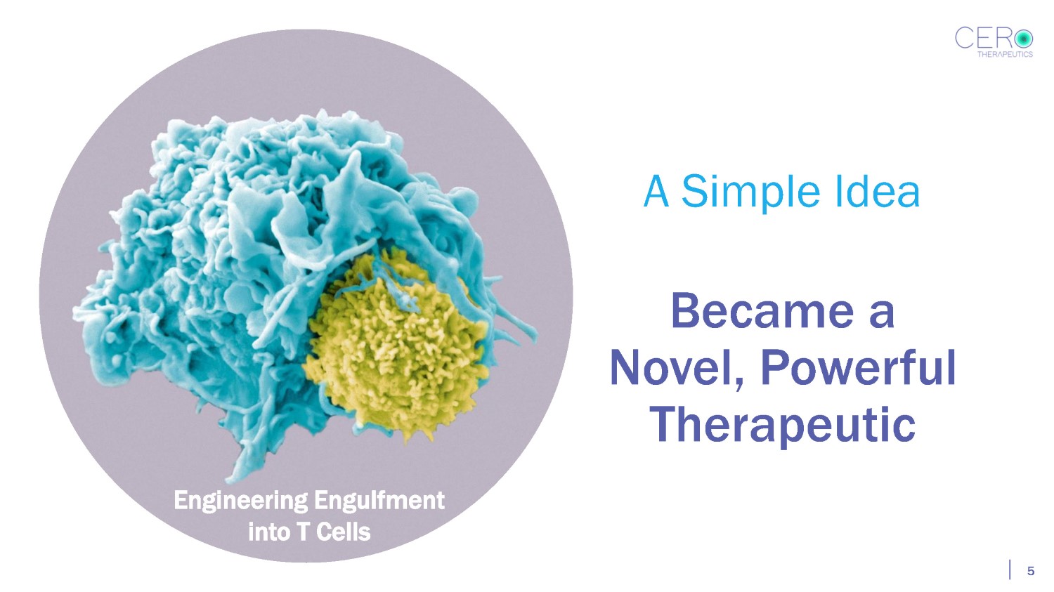 • First - in - Class cell therapy candidate for cancer, combining Phagocytosis and Tumor Cell Lysis in a single engineered T Cell • Targets a unique cell surface “Eat Me” ligand – Phosphatidylserine – upregulated on tumors • Demonstrated tumor - killing in NSCLC, Ovarian Cancer, MCL and AML – all tumor types evaluated by company to date • Pre - IND review with FDA December 2022 – plan to file IND in early 2024, critical tasks including GMP manufacturing well under way or completed • Phase I autologous cell therapy to target AML and salvage B cell Lymphoma • Raising $40M September 2023 via merger with public shell, covers IND filing and 25 - patient Phase I; solid tumor IND submission anticipated in 2025 • Seeking $25 - 30M new money from outside investors Overview 4
