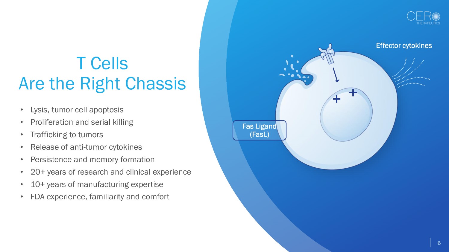 • Lysis, tumor cell apoptosis • Proliferation and serial killing • Trafficking to tumors • Release of anti - tumor cytokines • Persistence and memory formation • 20+ years of research and clinical experience • 10+ years of manufacturing expertise • FDA experience, familiarity and comfort T Cells Are the Right Chassis Effector cytokines Fas Ligand (FasL) 6