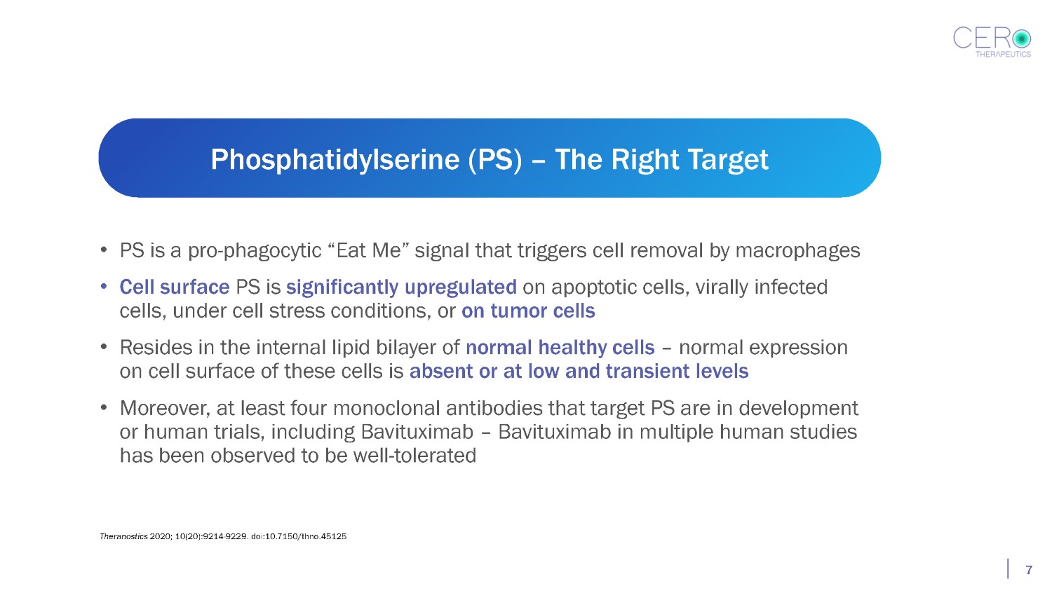 • PS is a pro - phagocytic “Eat Me” signal that triggers cell removal by macrophages • Cell surface PS is significantly upregulated on apoptotic cells, virally infected cells, under cell stress conditions, or on tumor cells • Resides in the internal lipid bilayer of normal healthy cells – normal expression on cell surface of these cells is absent or at low and transient levels • Moreover, at least four monoclonal antibodies that target PS are in development or human trials, including Bavituximab – Bavituximab in multiple human studies has been observed to be well - tolerated Phosphatidylserine (PS) – The Right Target 7 Theranostics 2020; 10(20):9214 - 9229. doi:10.7150/thno.45125