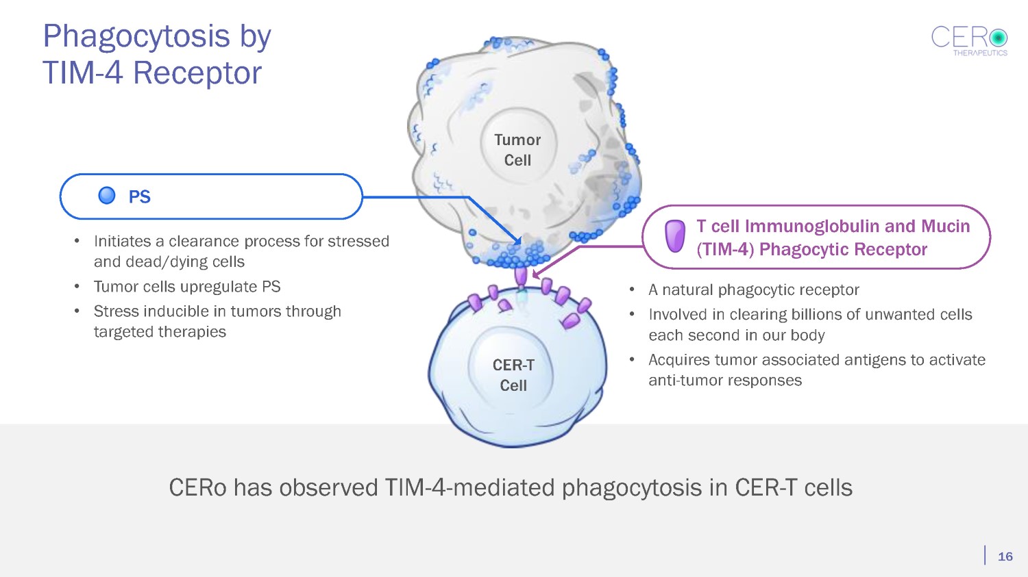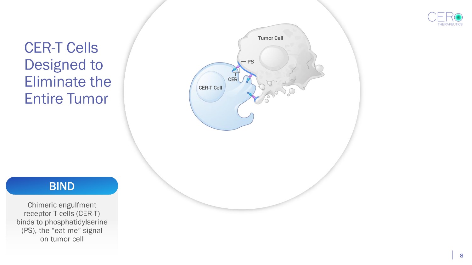 What is a CER - T cell? himeric ngulfment eceptor C E R Uses TIM - 4 Phagocytic Receptor to Engage Tumor Targets via the Cell of Damaged Receptor Phosphatidylserine (PS) Tumor Cell PS Tumor Cell CER - T Cell Multifunctional Construct Transmembrane Extracellular Domain Tumor binding and phagocytosis Intracellular Domain T cell activation and enhancement of phagocytosis “Eat me” signal PS Binding to PS triggers the capture of tumor cell fragments by the CER - T cell and activates cytotoxicity TIM - 4 Phagocytic Receptor Binds to PS CER - TCell 17