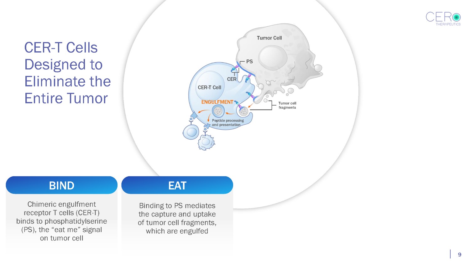CER - T Cells Designed to Eliminate the Entire Tumor Tumor Cell PS CER CER - T Cell Chimeric engulfment receptor T cells (CER - T) binds to phosphatidylserine (PS), the “eat me” signal on tumor cell 8 BIND
