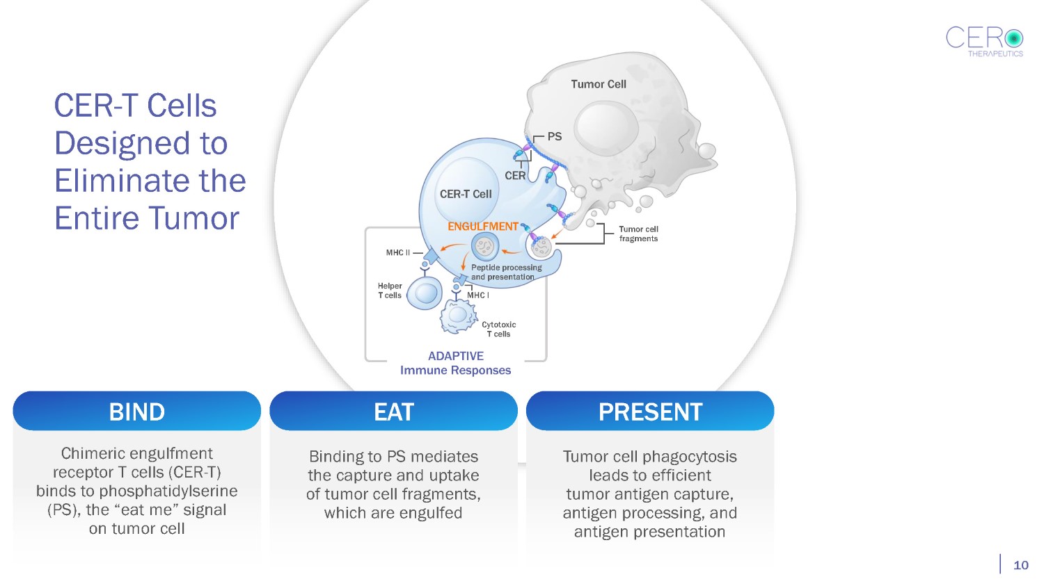 CER - T Cells Designed to Eliminate the Entire Tumor Tumor Cell PS CER CER - T Cell Peptide processing and presentation Tumor cell fragments ENGULFMENT Chimeric engulfment receptor T cells (CER - T) binds to phosphatidylserine BIND Binding to PS mediates the capture and uptake of tumor cell fragments, (PS), the “eat me” signal on tumor cell which are engulfed 9 EAT