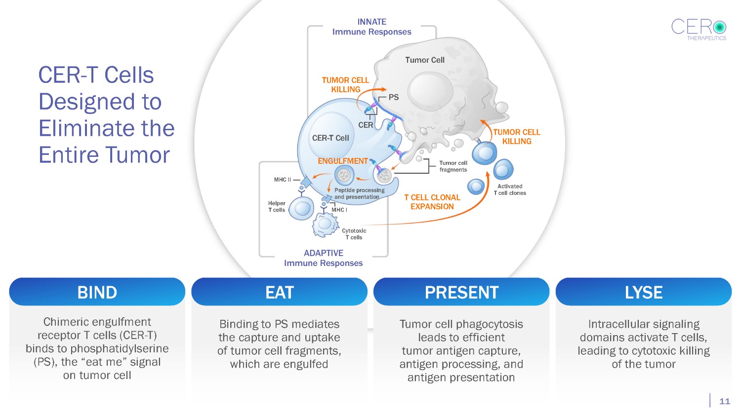 Tumor Cell PS CER CER - T Cell Peptide processing and presentation MHC I MHC II Helper T cells Cytotoxic T cells ADAPTIVE Immune Responses Tumor cell fragments ENGULFMENT CER - T Cells Designed to Eliminate the Entire Tumor Chimeric engulfment receptor T cells (CER - T) binds to phosphatidylserine BIND Binding to PS mediates the capture and uptake of tumor cell fragments, EAT Tumor cell phagocytosis leads to efficient tumor antigen capture, (PS), the “eat me” signal on tumor cell which are engulfed antigen processing, and antigen presentation 10 PRESENT