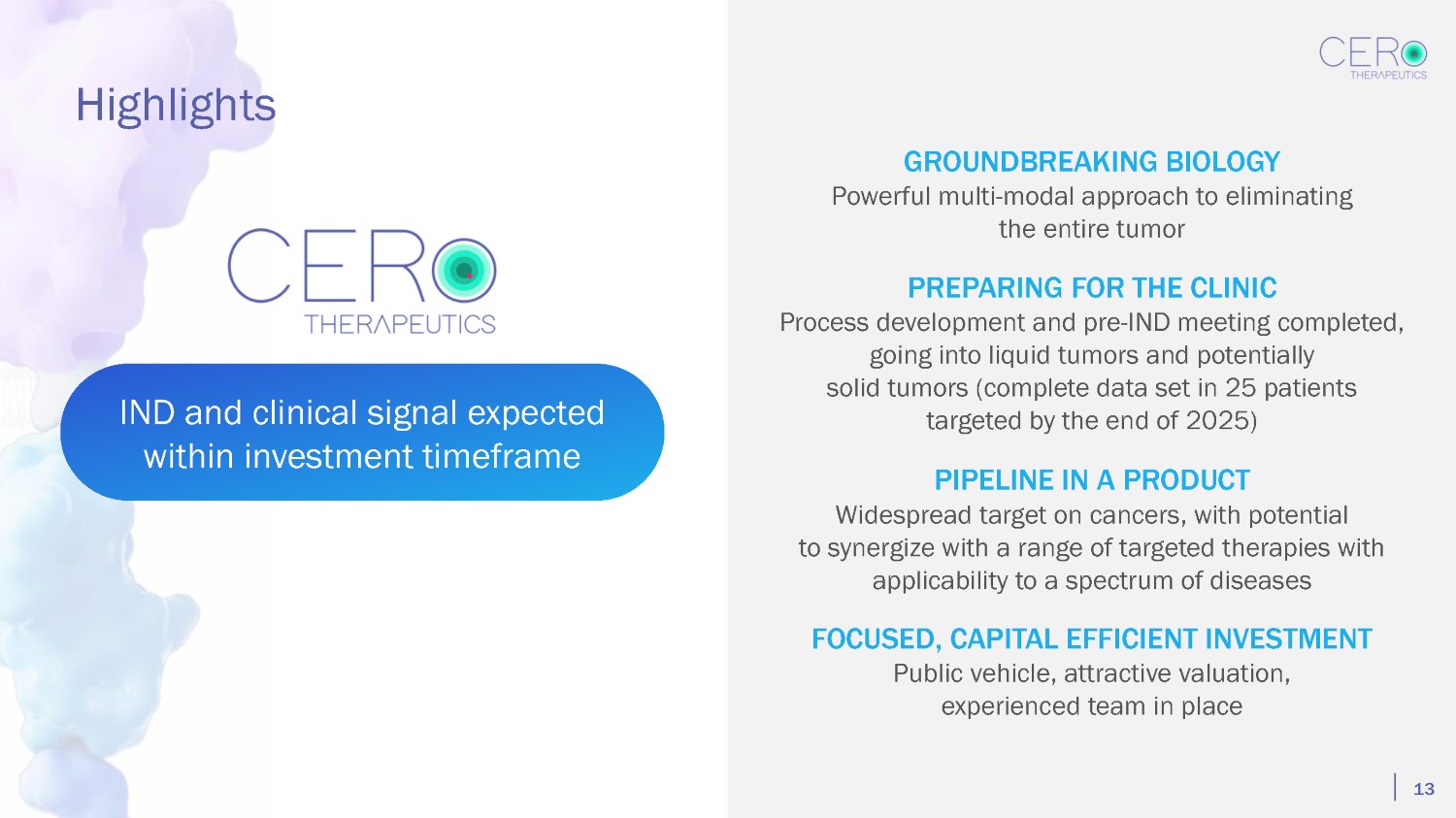 IND and clinical signal expected within investment timeframe GROUNDBREAKING BIOLOGY Powerful multi - modal approach to eliminating the entire tumor PREPARING FOR THE CLINIC Process development and pre - IND meeting completed, going into liquid tumors and potentially solid tumors (complete data set in 25 patients targeted by the end of 2025) PIPELINE IN A PRODUCT Widespread target on cancers, with potential to synergize with a range of targeted therapies with applicability to a spectrum of diseases FOCUSED, CAPITAL EFFICIENT INVESTMENT Public vehicle, attractive valuation, experienced team in place Highlights 13