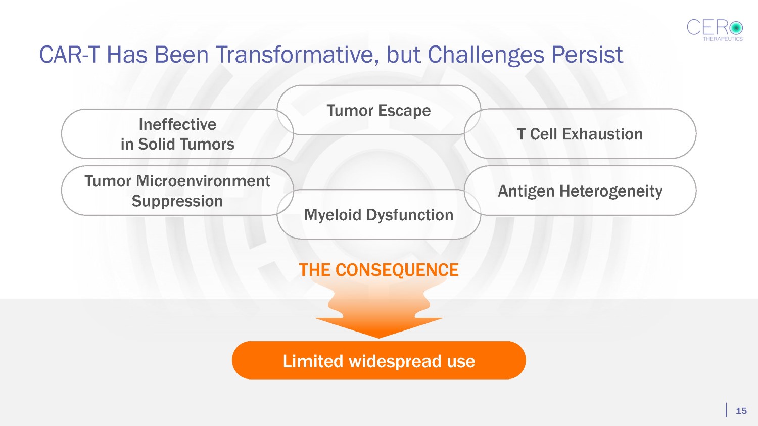 Brian Atwood Chief Executive Officer • Co - founder, President and CEO of Cell Design Labs (acquired by Gilead in 2017) • Chair, Phoenix Biotech Acquisition Corp • Former Chair, Locust Walk Acquisition Corp (NASD: LWAC) • Managing Director of Versant Ventures, co - founder in 1999 • Director and Chair Atreca, Inc. • Served on the boards of Immune Design Corp. (acquired by Merck), Veracyte, Five Prime (acquired by Amgen), and Cadence Pharmaceuticals (acquired by Mallinckrodt) Robert Sikorski, MD Consulting CMO • Managing Director, Woodside Way Ventures focused on novel biologic drug development • Previous CMO of eFFECTOR, Five Prime Therapeutics (acquired by Amgen) • Former leadership roles at AstraZeneca, Medimmune, and Amgen • Howard Hughes Fellow at the National Cancer Institute • Former editor of the journals Science and the Journal of the American Medical Association Chris Ehrlich Chief Operating Officer • CEO, Phoenix Biotech Acquisition Corp • Former CEO, Locust Walk Acquisition Corp • Former Senior Managing Director, Locust Walk • Former General Partner, Interwest Partners • Director at eFFECTOR Therapeutics, ProLynx • Genentech, LEK Consulting Daniel Corey, MD Founder and Chief Technology Officer • Stanford - trained and board - certified hematologist • Led the foundational discovery research of chimeric engulfment receptors • Completed fellowships in cell biology, immunology, and hematology - oncology at Duke and Stanford University Larry Corey Founder & Head of SAB • Co - founder of Juno Therapeutics • Co - founder of Vir Biotechnology • Co - founder of Immune Design • Faculty member and past President of the Fred Hutchinson Cancer Research Center • Member, National Academy of Medicine Experienced, Successful Senior Team to Be in Place Capital Efficient Execution to Date $40M from top investors Track Record of Success 14