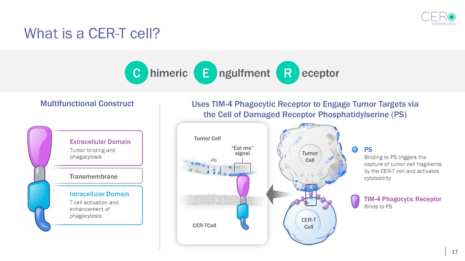 Phagocytosis by TIM - 4 Receptor CERo has observed TIM - 4 - mediated phagocytosis in CER - T cells Tumor Cell CER - T Cell • A natural phagocytic receptor • Involved in clearing billions of unwanted cells each second in our body • Acquires tumor associated antigens to activate anti - tumor responses • Initiates a clearance process for stressed and dead/dying cells • Tumor cells upregulate PS • Stress inducible in tumors through targeted therapies PS T cell Immunoglobulin and Mucin (TIM - 4) Phagocytic Receptor 16