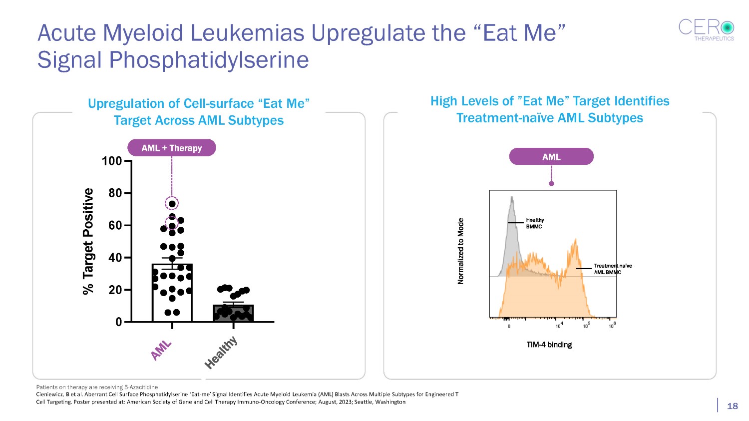 20 0 40 60 80 100 % Target Positive 18 Acute Myeloid Leukemias Upregulate the “Eat Me” Signal Phosphatidylserine TIM - 4 binding Normalized to Mode Treatment naïve AML BMMC Healthy BMMC AML + Therapy AML Upregulation of Cell - surface “Eat Me” Target Across AML Subtypes High Levels of ”Eat Me” Target Identifies Treatment - naïve AML Subtypes Patients on therapy are receiving 5 - Azacitidine Cieniewicz, B et al. Aberrant Cell Surface Phosphatidylserine ‘Eat - me’ Signal Identifies Acute Myeloid Leukemia (AML) Blasts Across Multiple Subtypes for Engineered T Cell Targeting. Poster presented at: American Society of Gene and Cell Therapy Immuno - Oncology Conference; August, 2023; Seattle, Washington