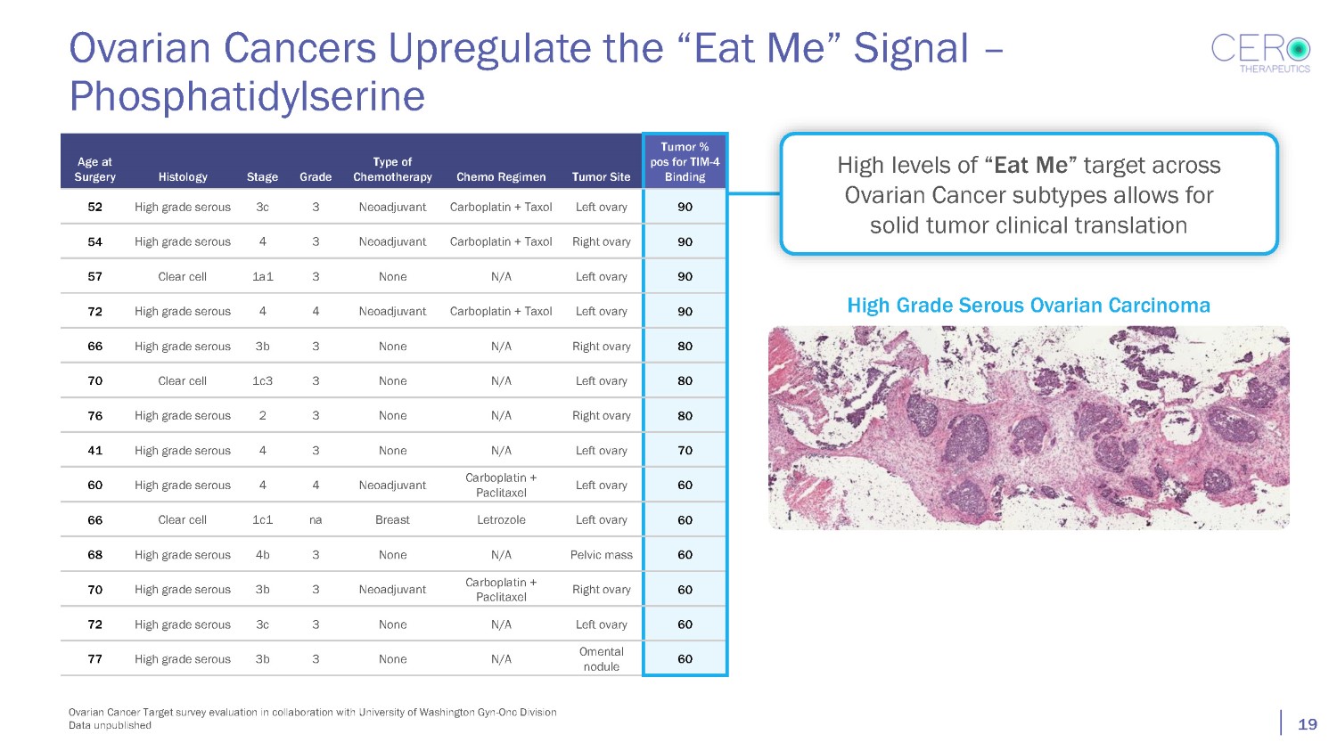 Age at Surgery Histology Stage Grade Type of Chemotherapy Chemo Regimen Tumor Site Tumor % pos for TIM - 4 Binding 52 High grade serous 3c 3 Neoadjuvant Carboplatin + Taxol Left ovary 90 54 High grade serous 4 3 Neoadjuvant Carboplatin + Taxol Right ovary 90 57 Clear cell 1a1 3 None N/A Left ovary 90 72 High grade serous 4 4 Neoadjuvant Carboplatin + Taxol Left ovary 90 66 High grade serous 3b 3 None N/A Right ovary 80 70 Clear cell 1c3 3 None N/A Left ovary 80 76 High grade serous 2 3 None N/A Right ovary 80 41 High grade serous 4 3 None N/A Left ovary 70 60 High grade serous 4 4 Neoadjuvant Carboplatin + Paclitaxel Left ovary 60 66 Clear cell 1c1 na Breast Letrozole Left ovary 60 68 High grade serous 4b 3 None N/A Pelvic mass 60 70 High grade serous 3b 3 Neoadjuvant Carboplatin + Paclitaxel Right ovary 60 72 High grade serous 3c 3 None N/A Left ovary 60 77 High grade serous 3b 3 None N/A Omental nodule 60 Ovarian Cancers Upregulate the “Eat Me” Signal – Phosphatidylserine Ovarian Cancer Target survey evaluation in collaboration with University of Washington Gyn - Onc Division Data unpublished High levels of “Eat Me” target across Ovarian Cancer subtypes allows for solid tumor clinical translation High Grade Serous Ovarian Carcinoma 19