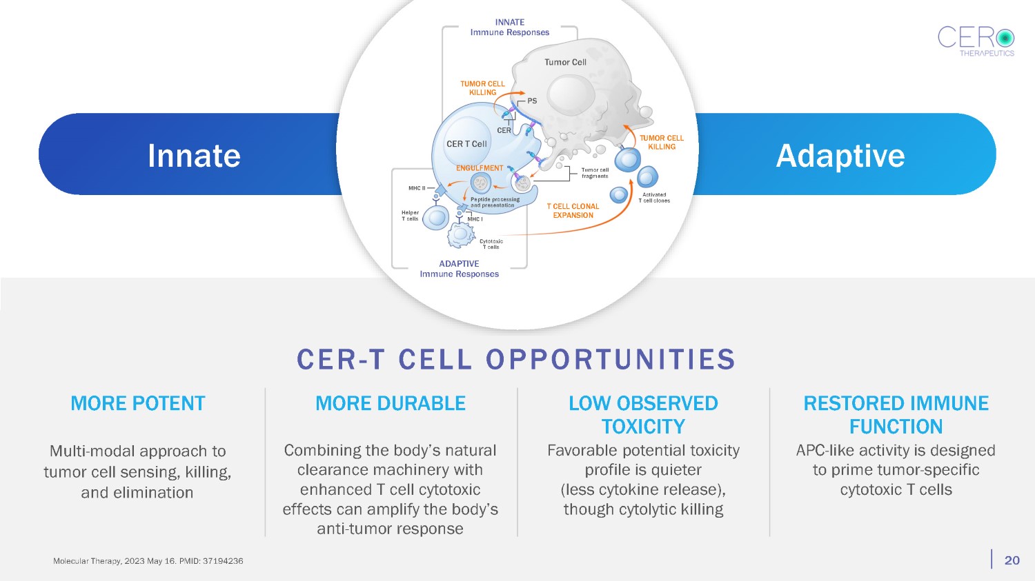 20 Multi - modal approach to tumor cell sensing, killing, and elimination Combining the body’s natural clearance machinery with enhanced T cell cytotoxic effects can amplify the body’s anti - tumor response MORE POTENT MORE DURABLE LOW OBSERVED TOXICITY Favorable potential toxicity profile is quieter (less cytokine release), though cytolytic killing RESTORED IMMUNE FUNCTION APC - like activity is designed to prime tumor - specific cytotoxic T cells CER - T CELL OPPORTUNITIES CER T Cell INNATE Immune Responses Tumor Cell TUMOR CELL KILLING PS CER Peptid and MHC II Helper T cells ENGULFMENT Adaptive Innate Molecular Therapy, 2023 May 16. PMID: 37194236