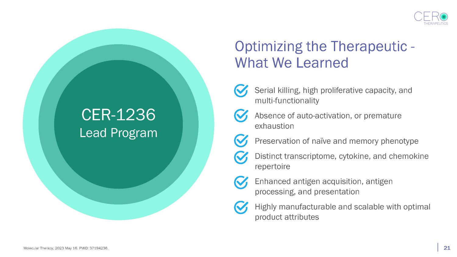 Optimizing the Therapeutic - What We Learned Serial killing, high proliferative capacity, and multi - functionality Absence of auto - activation, or premature exhaustion Preservation of naïve and memory phenotype Distinct transcriptome, cytokine, and chemokine repertoire Enhanced antigen acquisition, antigen processing, and presentation Highly manufacturable and scalable with optimal product attributes CER - 1236 Lead Program 21 Molecular Therapy, 2023 May 16. PMID: 37194236.