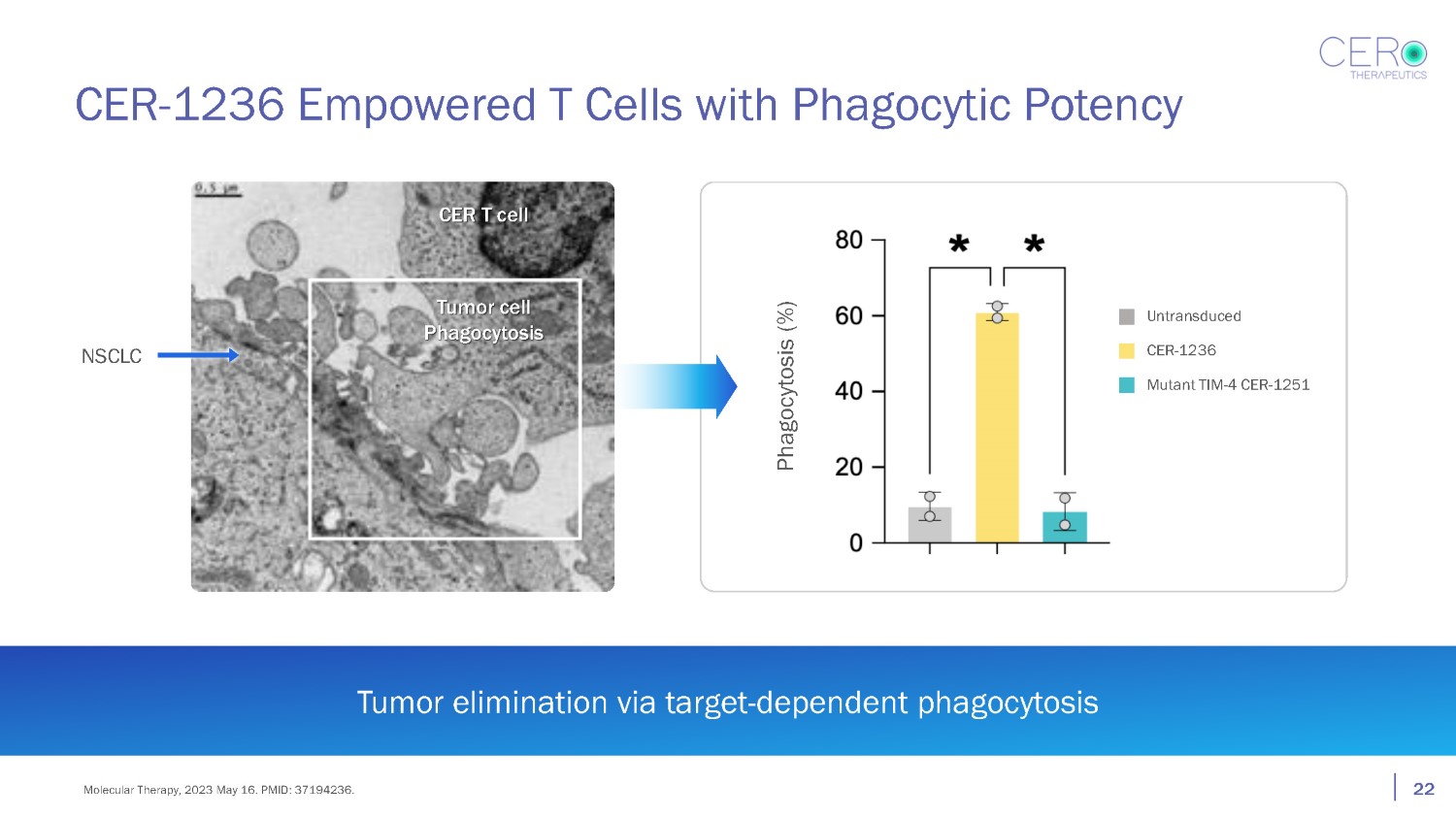 Tumor elimination via target - dependent phagocytosis Phagocytosis (%) CER - 1236 Empowered T Cells with Phagocytic Potency Untransduced CER - 1236 Mutant TIM - 4 CER - 1251 CER T cell Tumor cell Phagocytosis NSCLC 22 Molecular Therapy, 2023 May 16. PMID: 37194236.