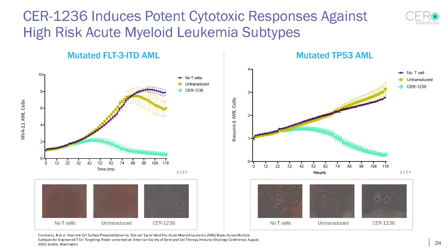0 2 4 6 8 10 0 12 22 32 42 52 62 74 86 96 106 116 Time (hrs) No T cells Untransduced CER - 1236 2:1 E:T 0 0 1 2 3 4 No T c U CER - 1236 Induces Potent Cytotoxic Responses Against High Risk Acute Myeloid Leukemia Subtypes 24 Mutated FLT - 3 - ITD AML Mutated TP53 AML Kasumi - 1 AML Cells MV4 - 11 AML Cells No T cells Untransduced CER - 1236 No T cells Untransduced CER - 1236 2:1 E:T Cieniewicz, B et al. Aberrant Cell Surface Phosphatidylserine ‘Eat - me’ Signal Identifies Acute Myeloid Leukemia (AML) Blasts Across Multiple Subtypes for Engineered T Cell Targeting. Poster presented at: American Society of Gene and Cell Therapy Immuno - Oncology Conference; August, 2023; Seattle, Washington